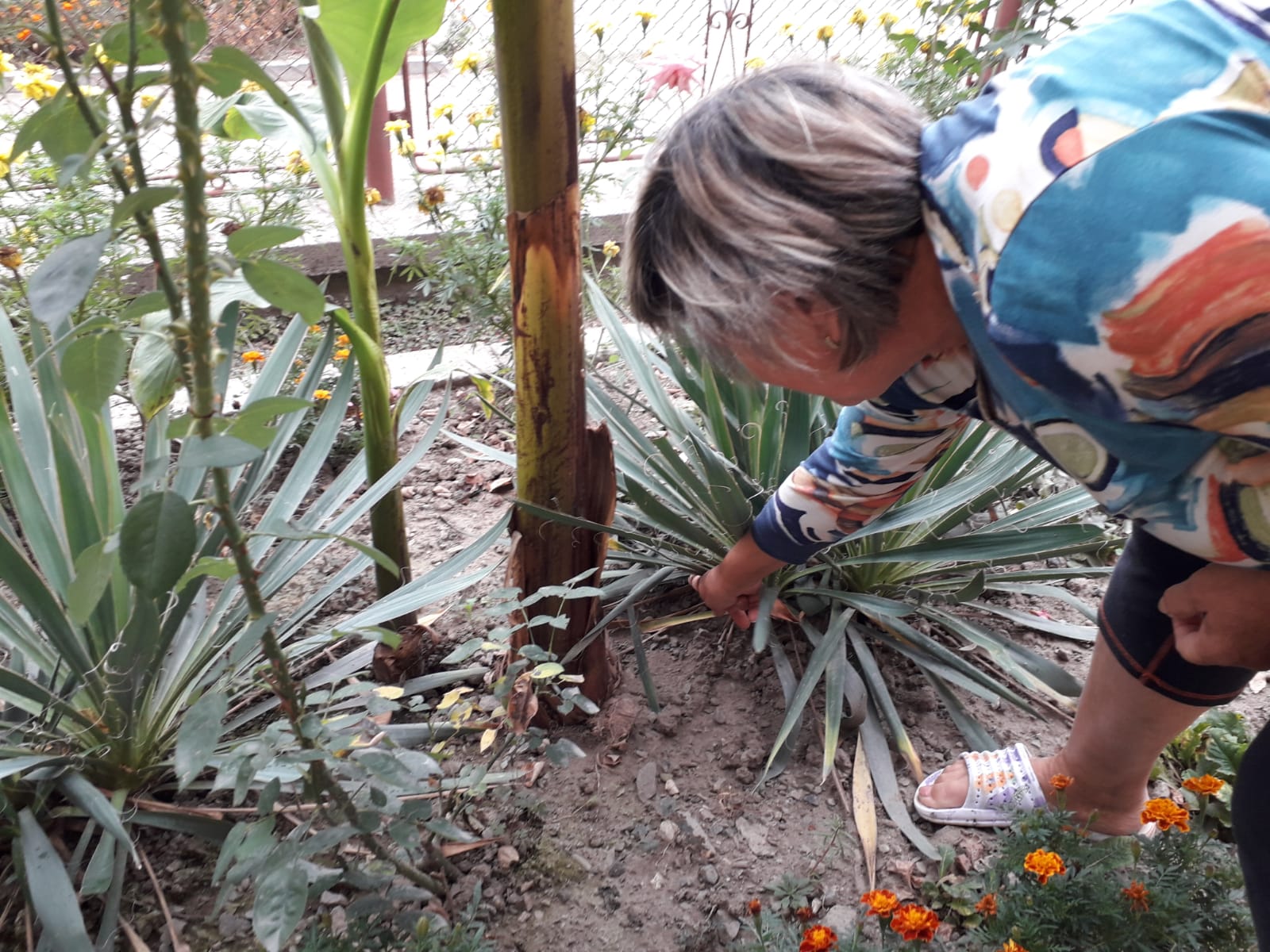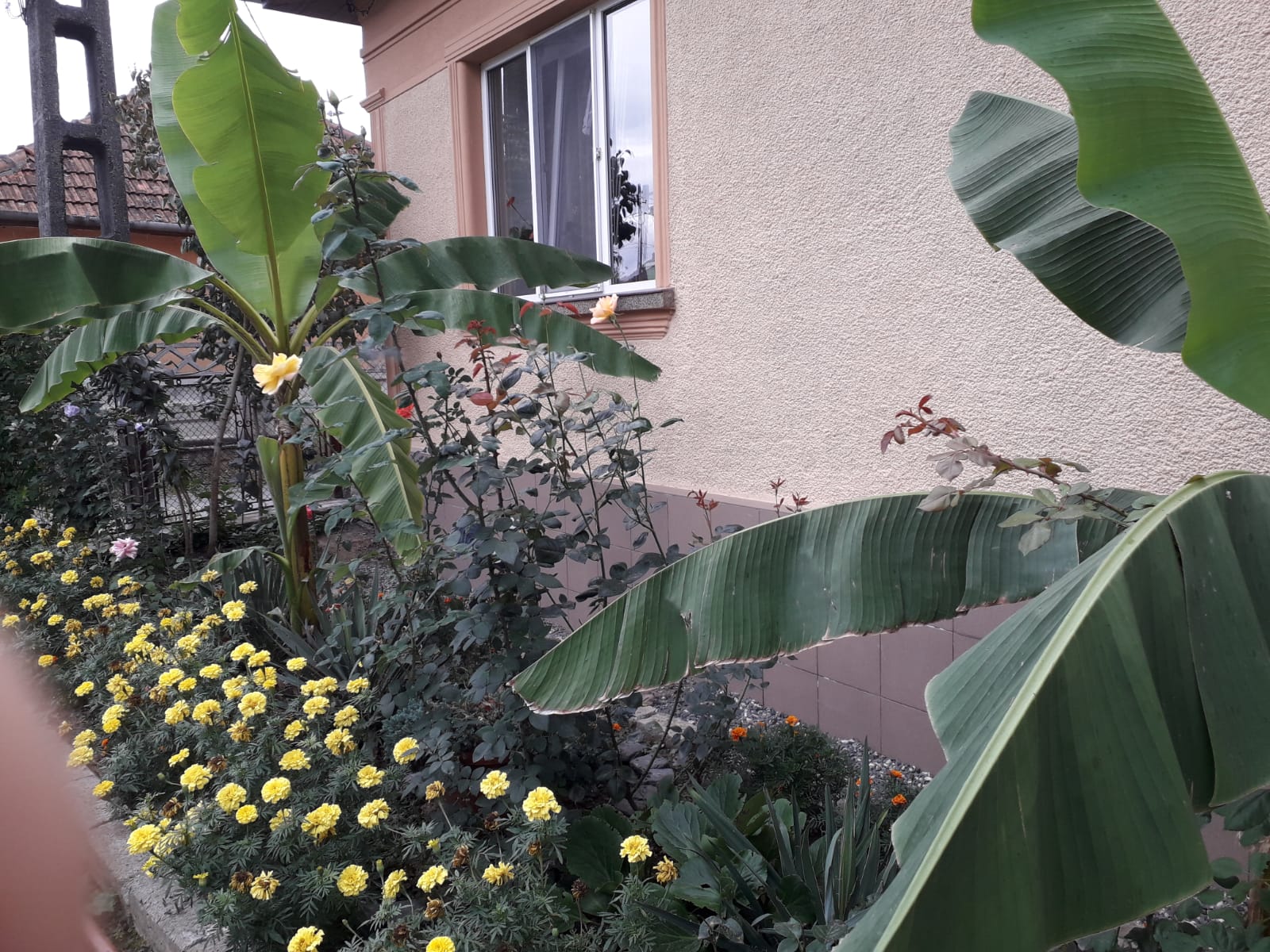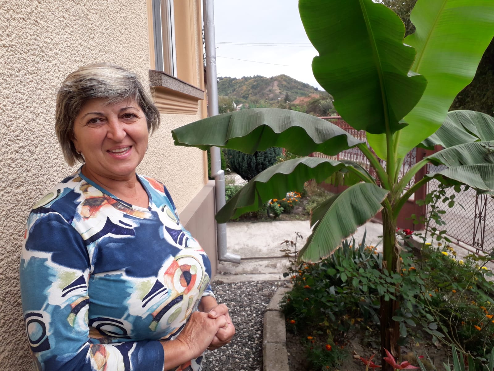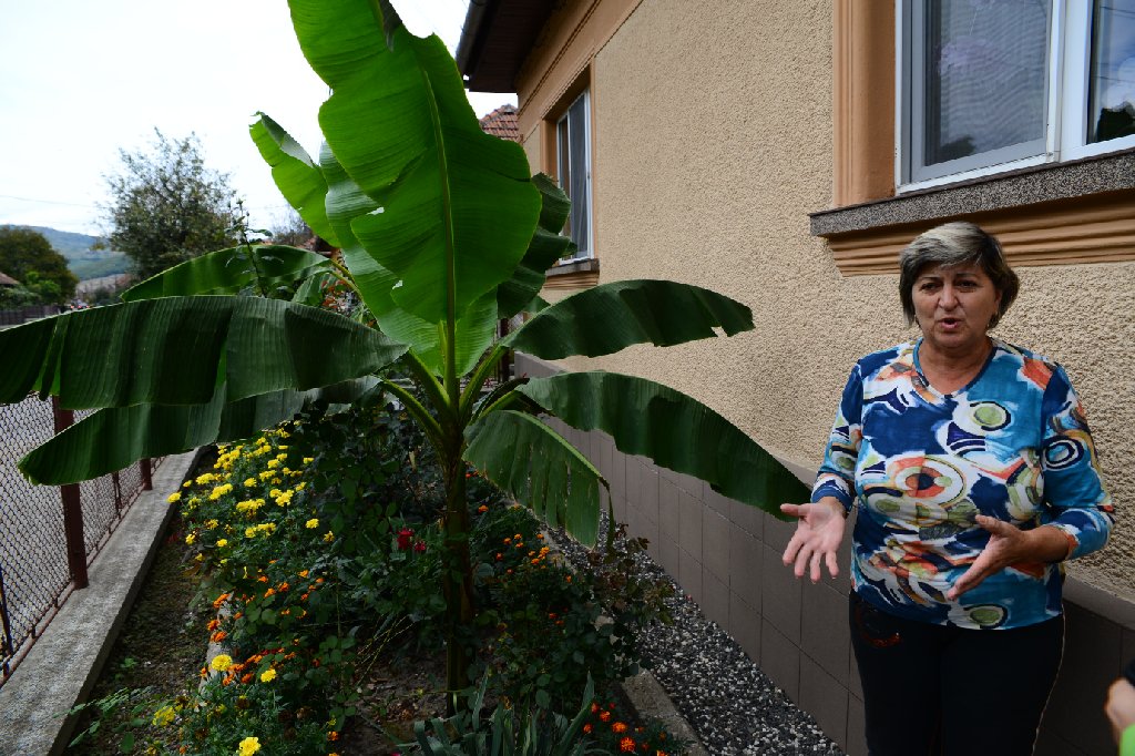 Se vede limpede că femeii îi plac florile şi are o curte extrem de frumos îngrijită. Aşa s-a ales şi cu bananierii în grădină: „Florile şi plantele sunt pasiunea mea, dintotdeauna am iubit florile. Am primit un bananier şi l-am îndrăgit. Mi s-a părut mai deosebit. Iniţial am făcut un aranjament şi nepoatei îi plăcea tare mult să stea acolo. M-am gândit: „Hai, să văd dacă pot să crească!” De bananierii ăştia o să ţin mult şi bine pentru că, aşa cum sunt plantaţi în faţa casei, arată tare bine, dar ne apără şi de praful ridicat de maşinile care trec pe drum. Înainte, de-abia ţineam geamul deschis, acum nu mai avem treabă.”