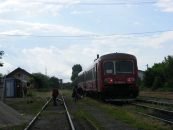 În sfârșit vine trenul, de la Arad către Brad, linie veche, dar recent repusă în funcțiune. E roșu, cu două vagoane, parcă de pe vremea Războiului Mondial!