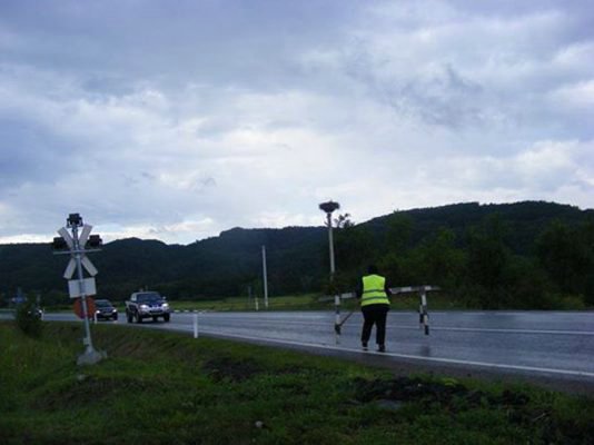 Nu știu dacă ați mai văzut ”bariere” manevrate cu mâna pentru a opri circulația de la șosea! Asta face o doamnă împiegat la halta din localitatea Lunca Moților, zona Brad.