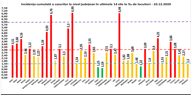 Coeficientul infectărilor cumulate la 14 zile, raportate la 1.000 de locuitori este calculat de către Direcțiile de Sănătate Publică, la nivelul Municipiului București și al județelor. Mai jos aveți graficul realizat în baza raportărilor primite de CNCCI de la Direcțiile de Sănătate Publică: