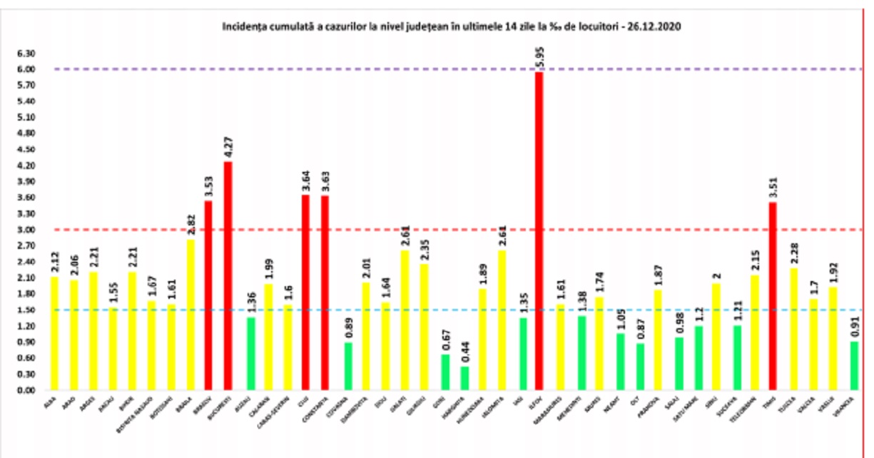 Coeficientul infectărilor cumulate la 14 zile, raportate la 1.000 de locuitori este calculat de către Direcțiile de Sănătate Publică, la nivelul Municipiului București și al județelor. Mai jos aveți graficul realizat în baza raportărilor primite de CNCCI de la Direcțiile de Sănătate Publică: