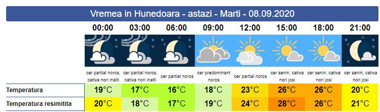 Marți, temperaturile se mențin ridicate. Soarele va răsări la ora 06:57 și va mai lenevi printre nori până spre amiaza zilei când își va intra în atribuții. Posibil, în zonele joase să se aștearnă ceața. În general ziua va fi una plăcută. Soarele apune la ora 19:54. Temperaturile minime se vor situa între 16 și 18 grade, iar maxima zile resimțită va atinge 28 de grade.