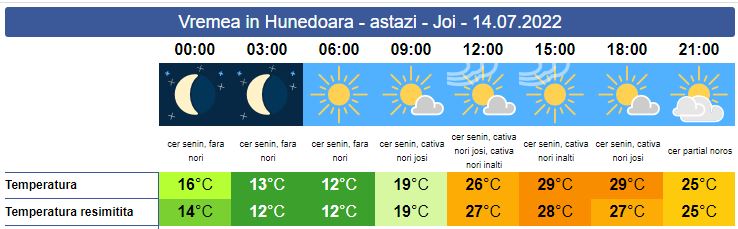 Joi, cerul va fi mai mult senin. Soarele răsare la ora 05:50. La orele dimineții temperaturile se mențin modeste pentru această dată. Peste zi, temperaturile vor crește semnificativ, dar spre seară norii se vor aduna. Vântul va sufla slab și moderat. Soarele va apune la ora 21:18. Maxima zilei va urca spre 30 de grade.