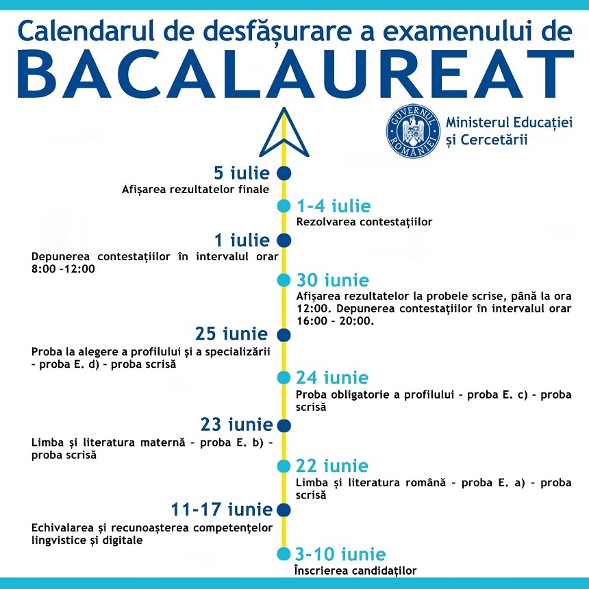 Înscrierile la Bacalaureat încep în 3 iunie, din 22 iunie au loc examenele scrise, iar în 30 iunie este programată afişarea rezultatelor, conform calendarului aprobat de ministrul Educaţiei şi anunţat luni. De asemenea, distanţa între elevi în sălile de examen va fi de cel puţin 2 metri. Elevii care se află în izolare sau cei confirmaţi pozitiv cu noul coronavirus, dar şi cei care au diferite afecţiuni cronice sau cei care prezintă un risc crescut de infecţie/de a dezvolta complicaţii asociate infecţiei Sars-CoV-2 vor susţine examenul conform unei proceduri speciale, elaborate de către Ministerul Educaţiei şi Cercetării şi Ministerul Sănătăţii.