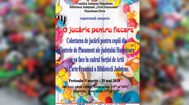 În fiecare an, în perioada premergătoare Zilei Internaționale a Copilului, 1 iunie, Biblioteca Județeană „Ovid Densusianu” Hunedoara-Deva se mobilizează în acțiunea O jucărie pentru fiecare, inițiată în urmă cu câțiva ani. Cu acest prilej, pornim o amplă campanie de sensibilizare și atragere a membrilor comunității, a locuitorilor din județul Hunedoara pentru a le dărui jucării copiilor din centrele de plasament ale județului.