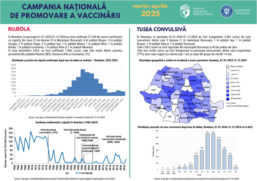 În perioada martie-aprilie 2025, la nivelul întregii țări se vor desfășura activități de promovare a vaccinării, conform Calendarului Național de Vaccinare. Această inițiativă urmărește să crească nivelul de conștientizare cu privire la importanța vaccinărilor și să încurajeze părinții să-și protejeze copiii împotriva bolilor care pot fi prevenite prin vaccinare.
