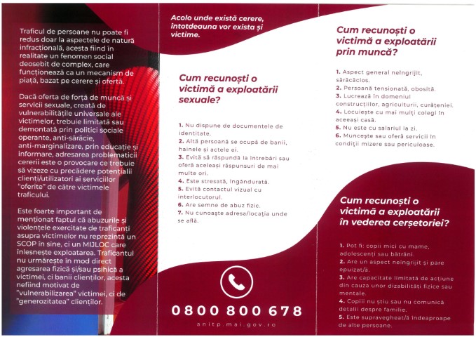 Astfel, Compartimentul Intervenție în Situații de Urgență și Prevenire Marginalizare Socială distribuie, în toate cartierele din municipiul Deva și la sediile serviciilor sociale, materiale informative ce conțin atât mesaje anti-trafic de persoane și de prevenire a acestor infracțiuni, cât și modalități de recunoaștere a victimelor exploatării. Totodată, în pliantele și afișele distribuite se regăsește numărul liniei TelVerde la care pot fi semnalate cazurile de trafic de persoane – 0800.800.678.