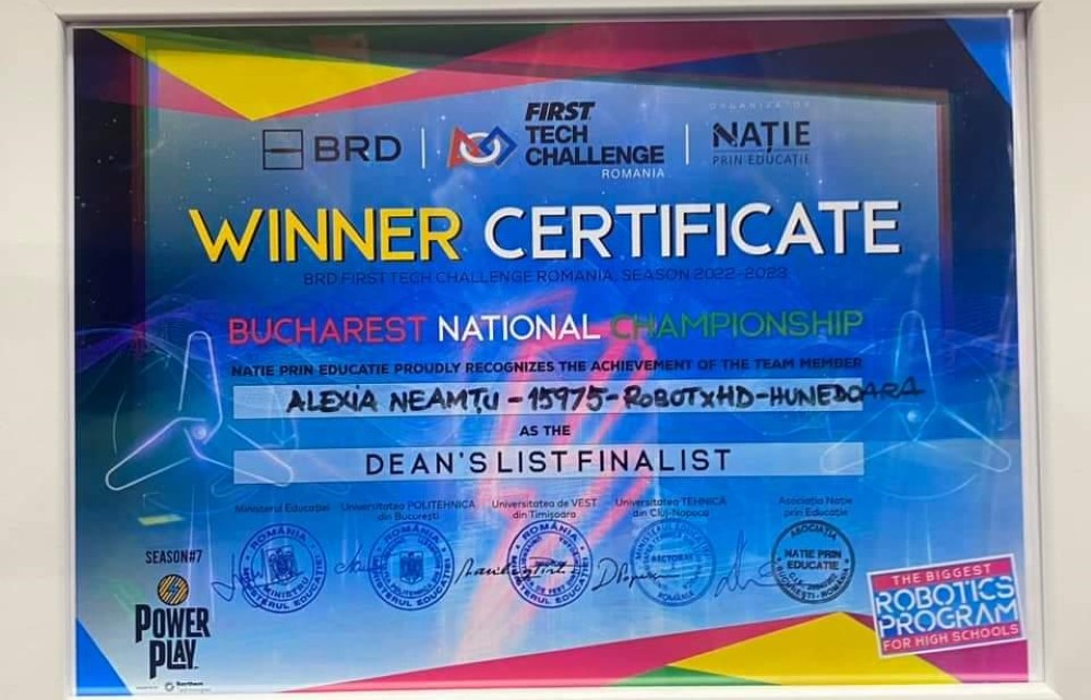 Selecţia este extrem de dură – la nivel mondial, din circa 100 de mii de copii buni, rămân doar zece care primesc Dean’s List Award: „Este unul la zece mii, cam asta este proporţia de reuşită şi competiţia acerbă confirmă că ei vor fi lideri în inovare, în ştiinţă şi tehnologie în anii care urmează. România stă foarte bine la acest capitol – faţă de multe alte ţări, avem dreptul la patru finalişti pentru această parte de competiţie, în condiţiile în care majoritatea sunt americani. Ar fi minunat să mai spargem o dată gheaţa americană şi să obţinem prin Alexia un alt Dean’s List Award.” Anul trecut, tot o elevă a liceului hunedorean – Brianna Alexandra Stan – a primit premiul, la Houston, chiar de la celebrul inventator Dean Kamen, care este şi iniţiatorul competiţiilor FIRST. Între timp, Brianna s-a mutat cu părinţii la Bucureşti, dar a obţinut deja o bursă la celebra Universitate Yale şi visează să aibă o companie în zona de inteligenţă artificială.