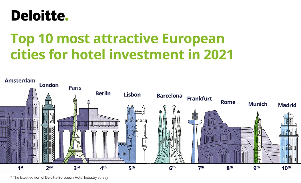 În contextul crizei sanitare, apetitul investitorilor pentru industria hotelieră a scăzut cu 25% în 2020 față de anul precedent. Cu toate acestea, orașe europene precum Amsterdam, Londra și Paris sunt considerate în continuare promițătoare pentru investiții în 2021. Amsterdam, care a condus clasamentul în ultimii patru ani, continuă să fie cel mai atractiv oraș pentru investițiile din domeniul hotelier, urmat de Londra și Paris, în timp ce Berlinul avansează pe poziția a patra de pe locul 16, ocupat anul trecut. În plus, studiul evidențiază faptul că apartamentele închiriate în regim hotelier – care sunt complet mobilate, disponibile pentru sejururi pe termen scurt și lung și care oferă facilități similare hotelurilor – devin cele mai interesante active europene pentru investiții în 2021, datorită creșterii cererii și costurilor flexibile.