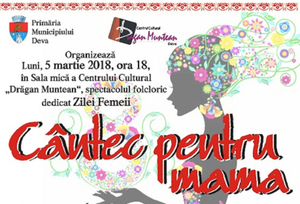Primăria Municipiului Deva şi Centrul Cultural „Drăgan Muntean” vă invită luni, 5 martie 2018, la ora 18.00, în sala mică a Centrului Cultural „Drăgan Muntean”, la spectacolul folcloric „Cântec pentru Mama”, dedicat Zilei Internaționale a Femeii.