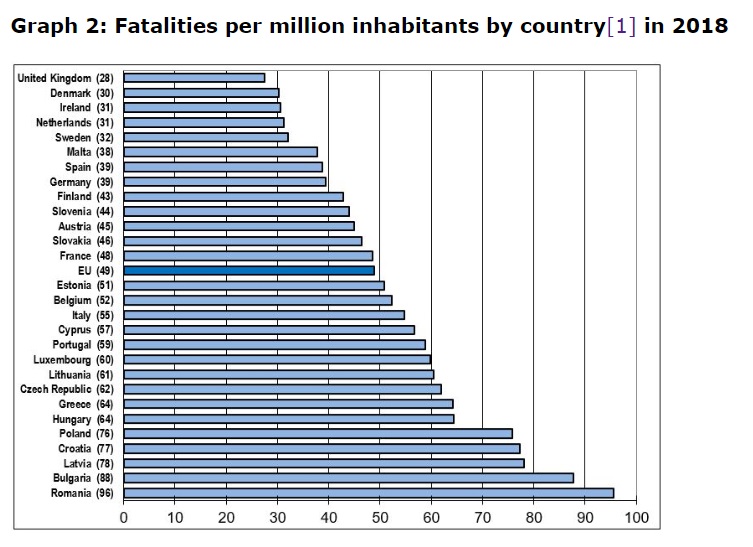 Concluziile acestui studiu trebuie privite în contextul în care România are cea mai mare rată a deceselor din accidente rutiere raportate la un milion de locuitori, din Uniunea Europeană. Conform statisticilor, anul trecut, doar două state europene au înregistrat o rată peste 80 de decese la un milion de locuitori: România – 96 și Bulgaria – 88. În 2018, majoritatea statelor membre au consemnat această rată sub 60 de decese la un milion de locuitori, media europenaă fiind 49 (conform graficului de mai jos).