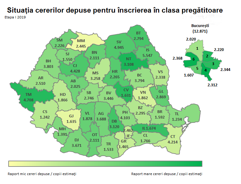 Dintre acestea, 106.779 de cereri (87,4%) vizează copii cu vârsta de şase ani (împliniţi până în 31 august 2019, inclusiv), iar 15.441 de cereri (12,6%), copii cu vârsta de şase ani (împliniţi în perioada 1 septembrie – 31 decembrie 2019, inclusiv).