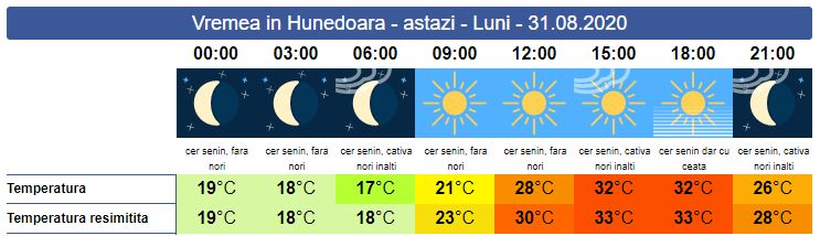 Săptămâna începe cu disconfort accentuat. Soarele răsare la ora 06:47. Pentru ziua de luni, prognoza meteo aduce temperaturi ridicate, în care indicele de temperatură-umezeală va depăși pragul critic de 80 de unități. Peste zi cerul va fi în general senin. În a doua parte a zilei posibil ca vântul să sufle cu unele intensificări. Spre seară valorile ridicate se mențin. În ultima zi a lunii august soarele va apune la ora 20:09. Temperaturile minime vor fi cuprinse între 17 și 21 de grade, iar cele maxime între 30 și 33 de grade.