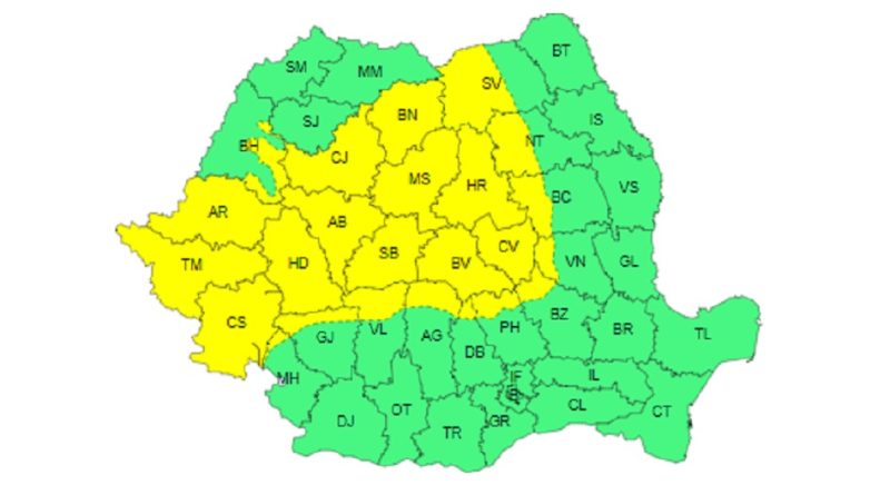 Intensificări ale vântului, în zona Carpaților Meridionali. Partea de sud a județului sub cod GALBEN