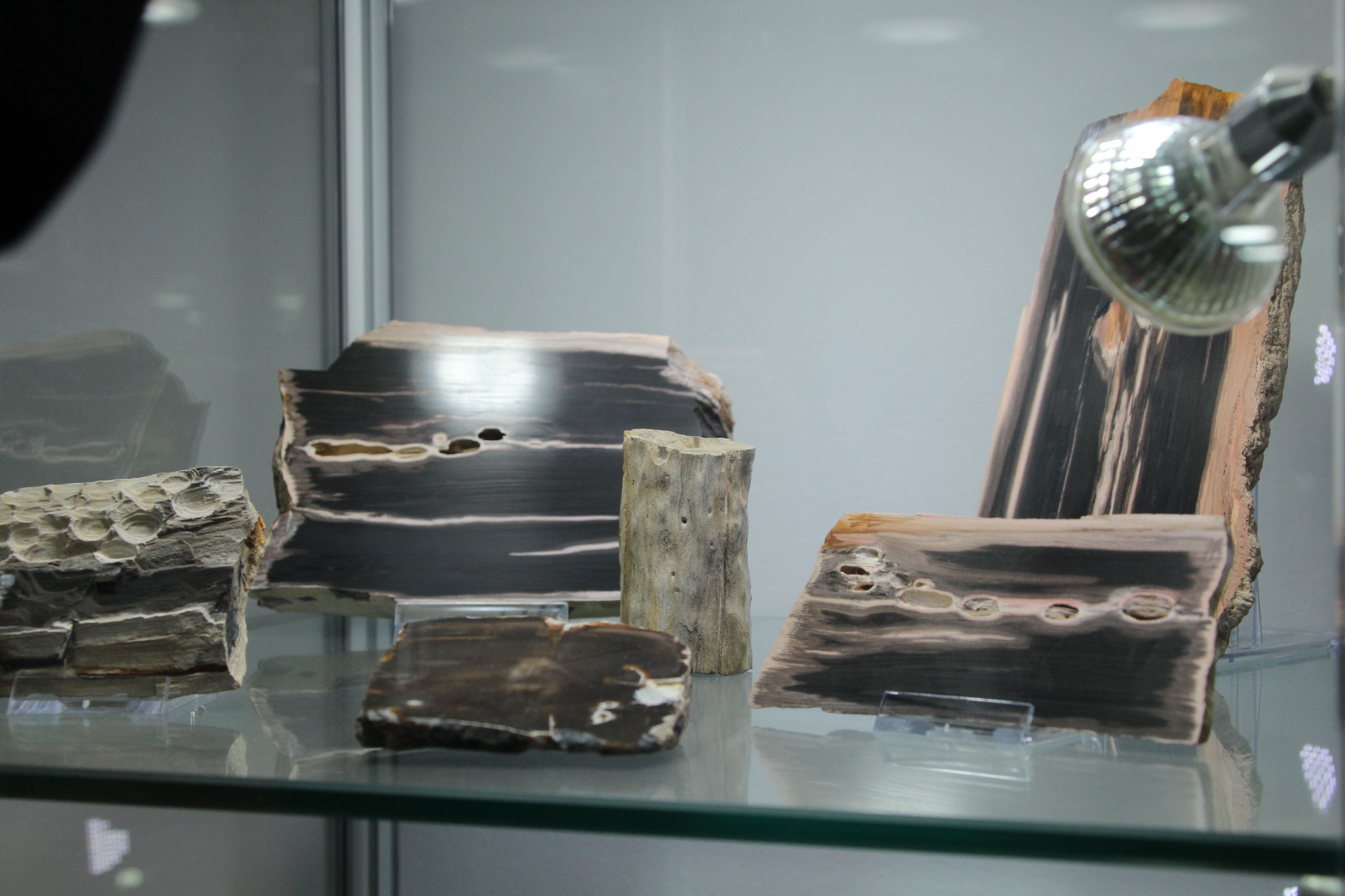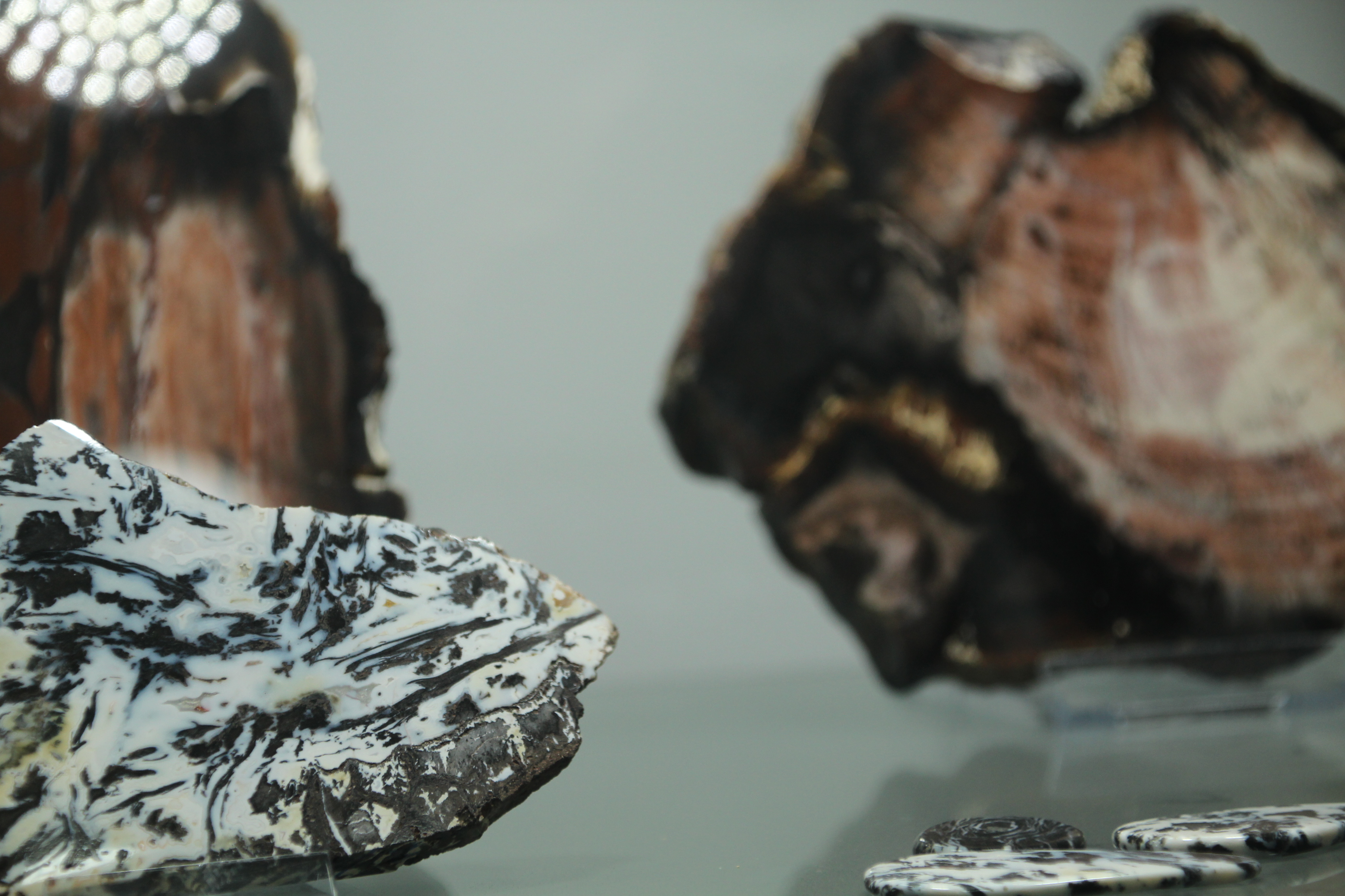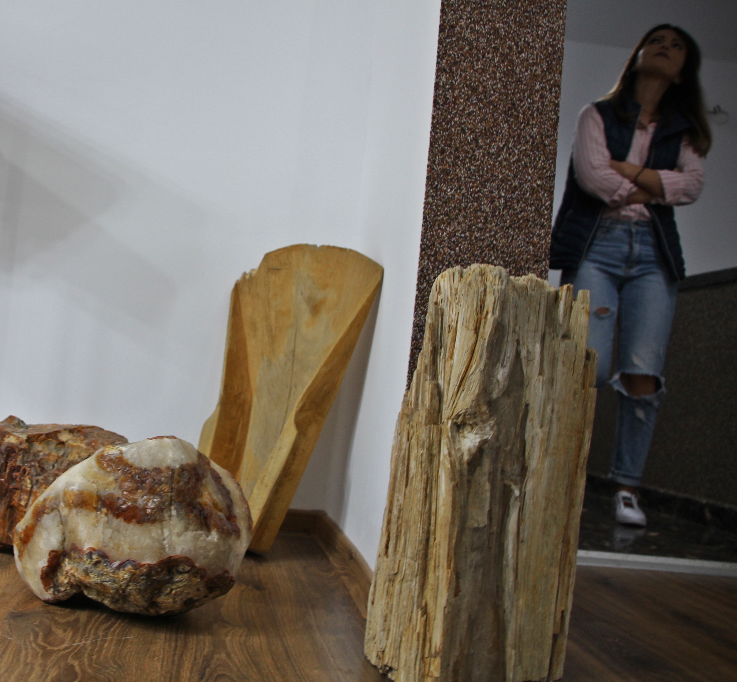 Un pas mai încolo, dai peste o piesă ciudată care arată ca o galerie subterană: e un lemn care s-a transformat într-o peşteră în miniatură: „S-a substituit lemnul complet şi, în golul respectiv, au apărut nişte depuneri ca nişte stalactite de calcedonie. Asta s-a întâmplat în milioane de ani, sunt procese de durată. Aceste procese continuă în zonele vulcanice, în rest, s-au oprit – vulcanul s-a răcit, s-a temperat, procesul s-a întrerupt. În urmă cu 8, 9, 10 milioane de ani, aici era o zonă vulcanică, un vulcanism de care se leagă mineralizaţiile aurifere şi cuprifere din zonă.” O altă secţiune prin rocă descoperă privitorului o bandă care împresoară un miez precum un gălbenuş- „Bănuiesc că este un fruct”, explică Toda. Toate aceste roci au fost vii cu milioane de ani în urmă – au căzut şi au fost acoperite de cenuşa vulcanică. De aici totul e chimie şi răbdare.