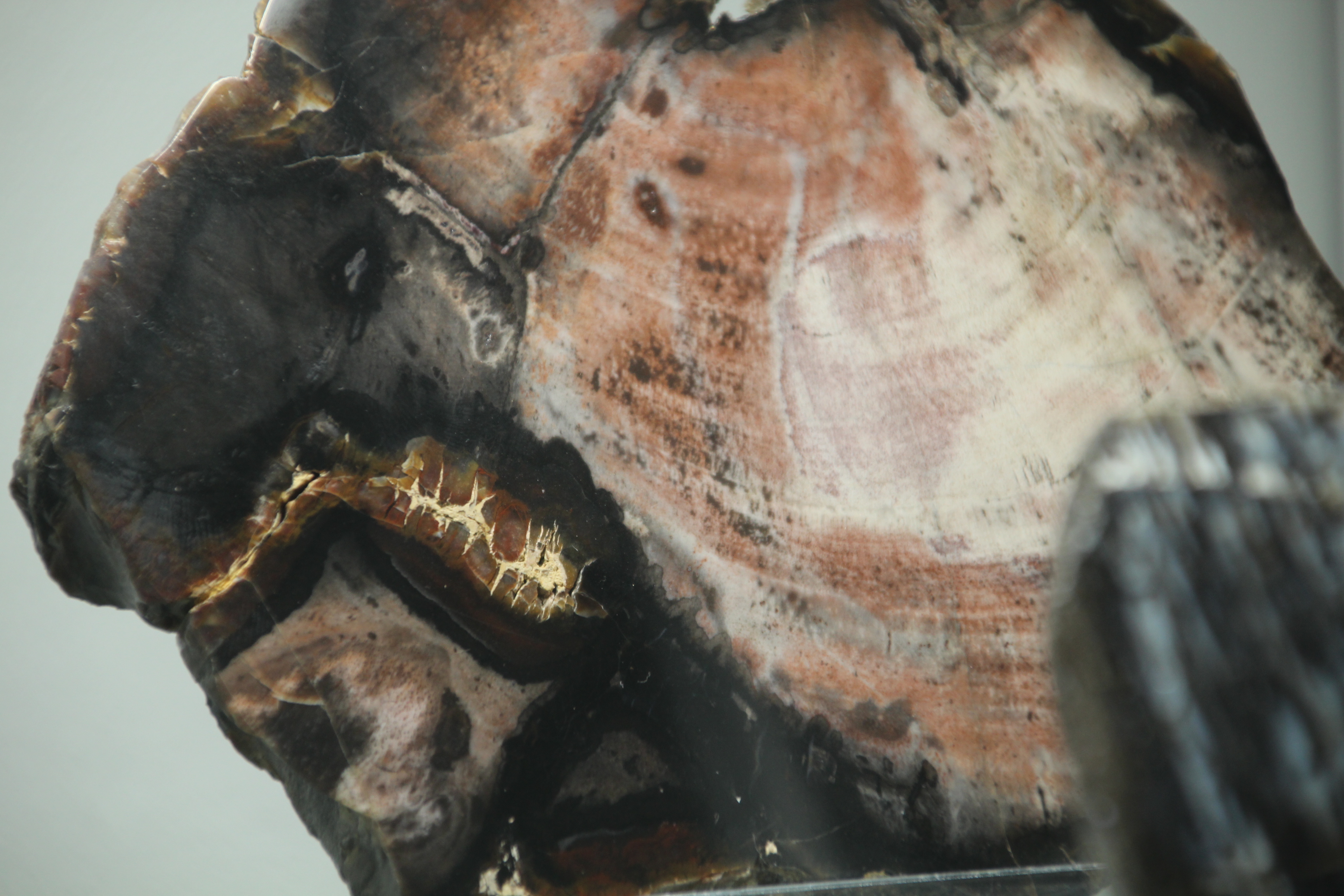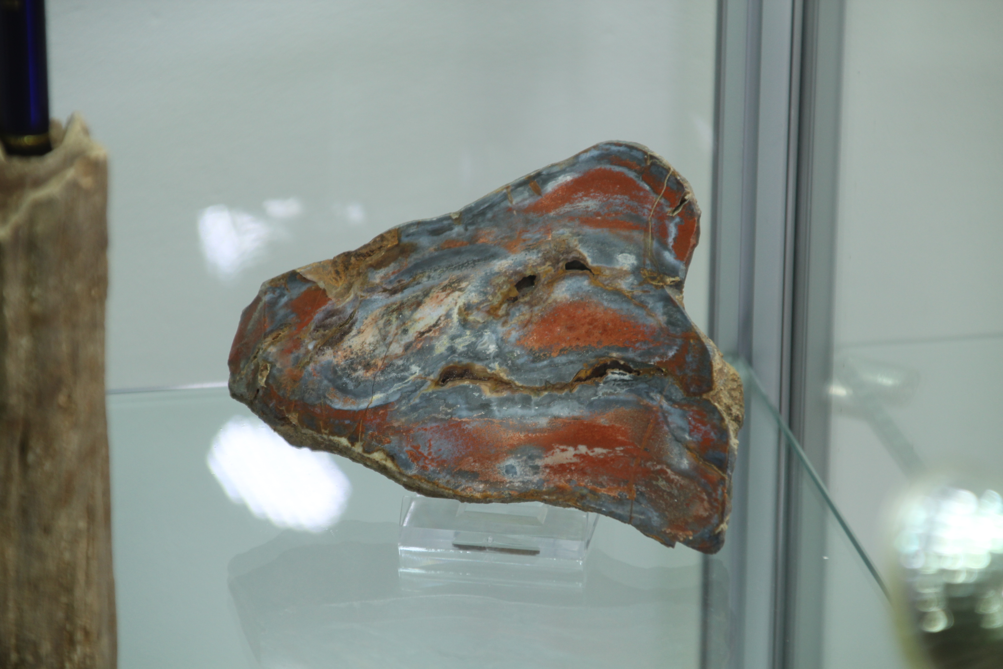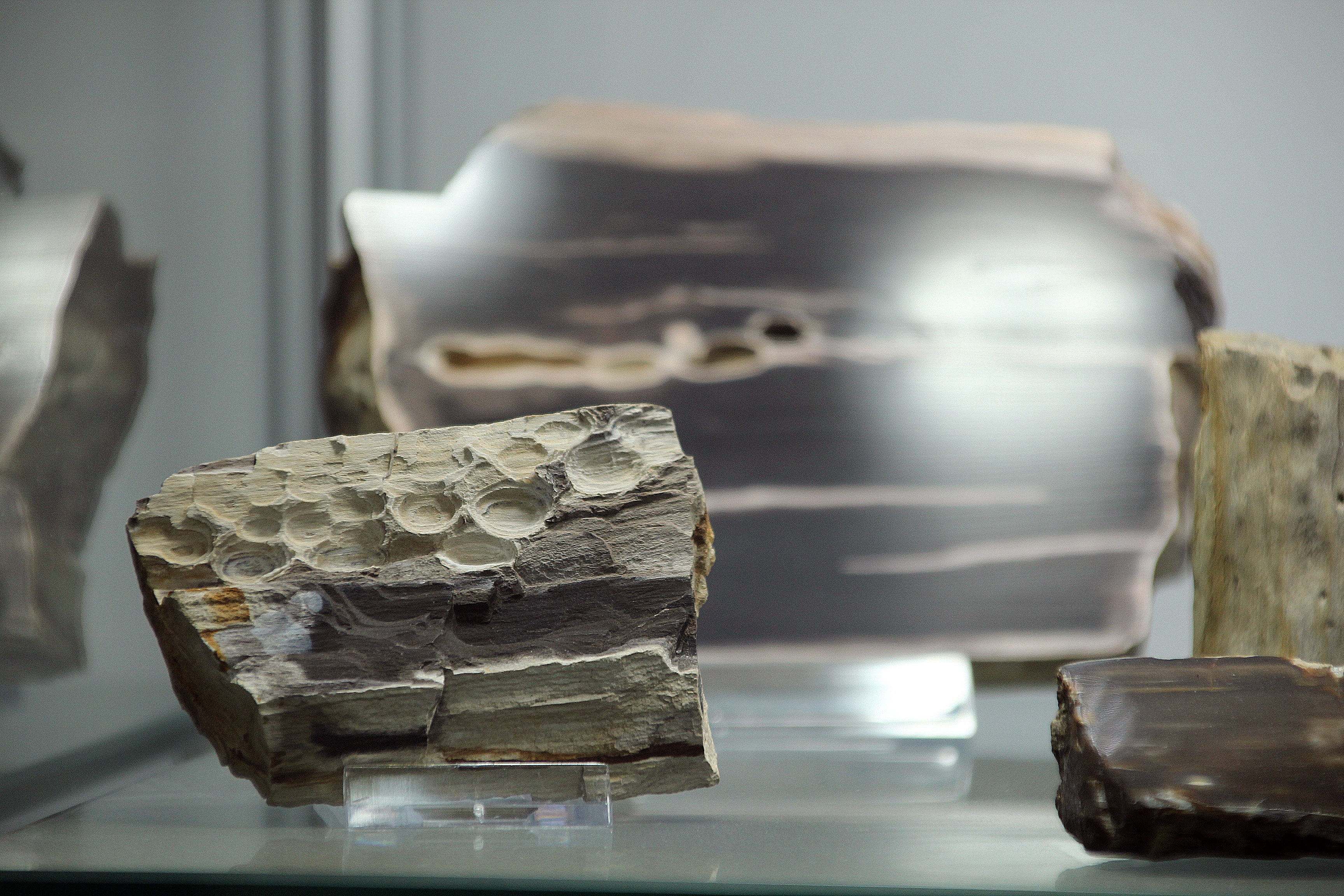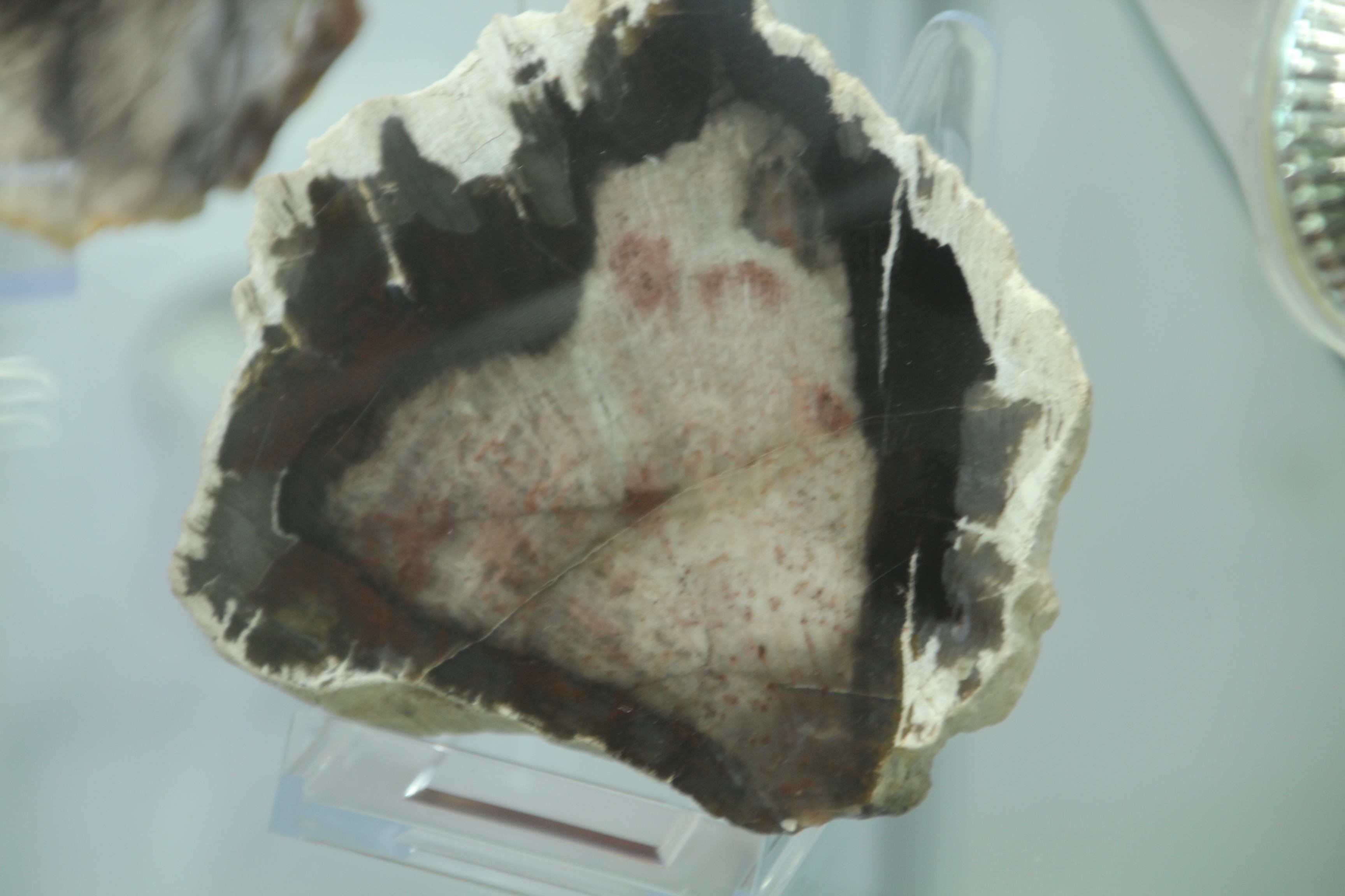 Un pas mai încolo, dai peste o piesă ciudată care arată ca o galerie subterană: e un lemn care s-a transformat într-o peşteră în miniatură: „S-a substituit lemnul complet şi, în golul respectiv, au apărut nişte depuneri ca nişte stalactite de calcedonie. Asta s-a întâmplat în milioane de ani, sunt procese de durată. Aceste procese continuă în zonele vulcanice, în rest, s-au oprit – vulcanul s-a răcit, s-a temperat, procesul s-a întrerupt. În urmă cu 8, 9, 10 milioane de ani, aici era o zonă vulcanică, un vulcanism de care se leagă mineralizaţiile aurifere şi cuprifere din zonă.” O altă secţiune prin rocă descoperă privitorului o bandă care împresoară un miez precum un gălbenuş- „Bănuiesc că este un fruct”, explică Toda. Toate aceste roci au fost vii cu milioane de ani în urmă – au căzut şi au fost acoperite de cenuşa vulcanică. De aici totul e chimie şi răbdare.