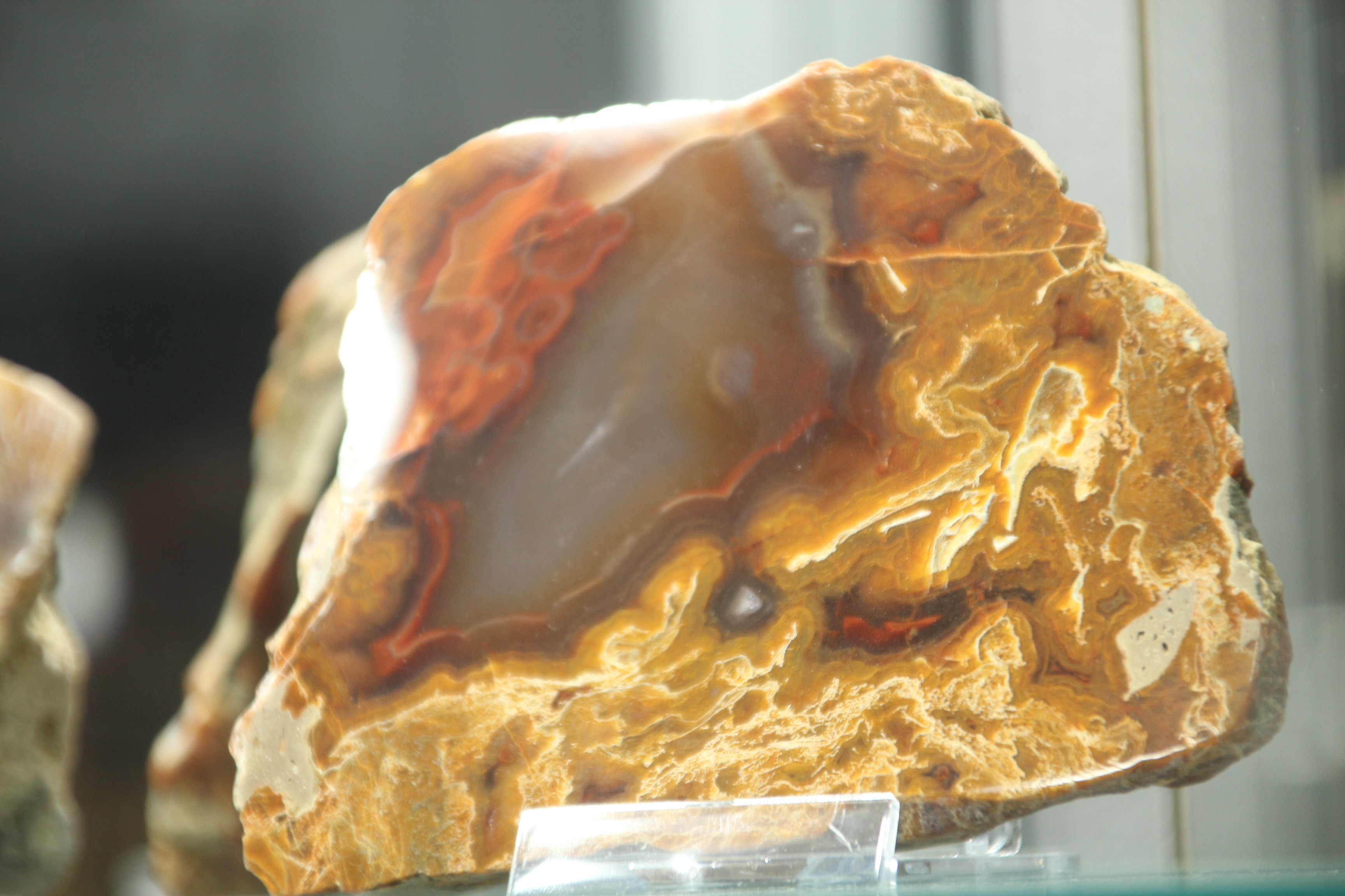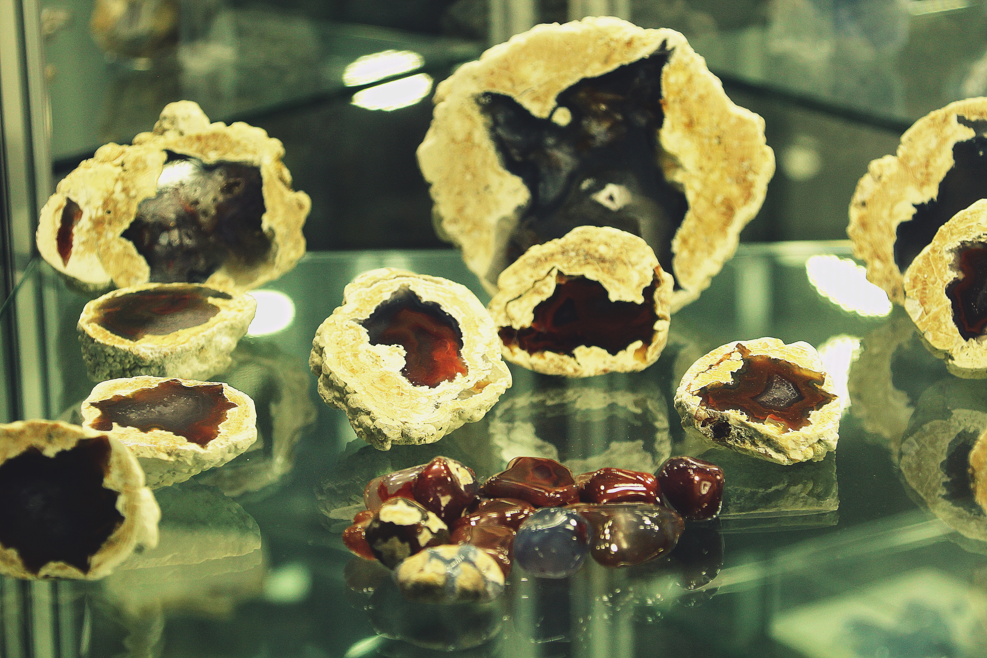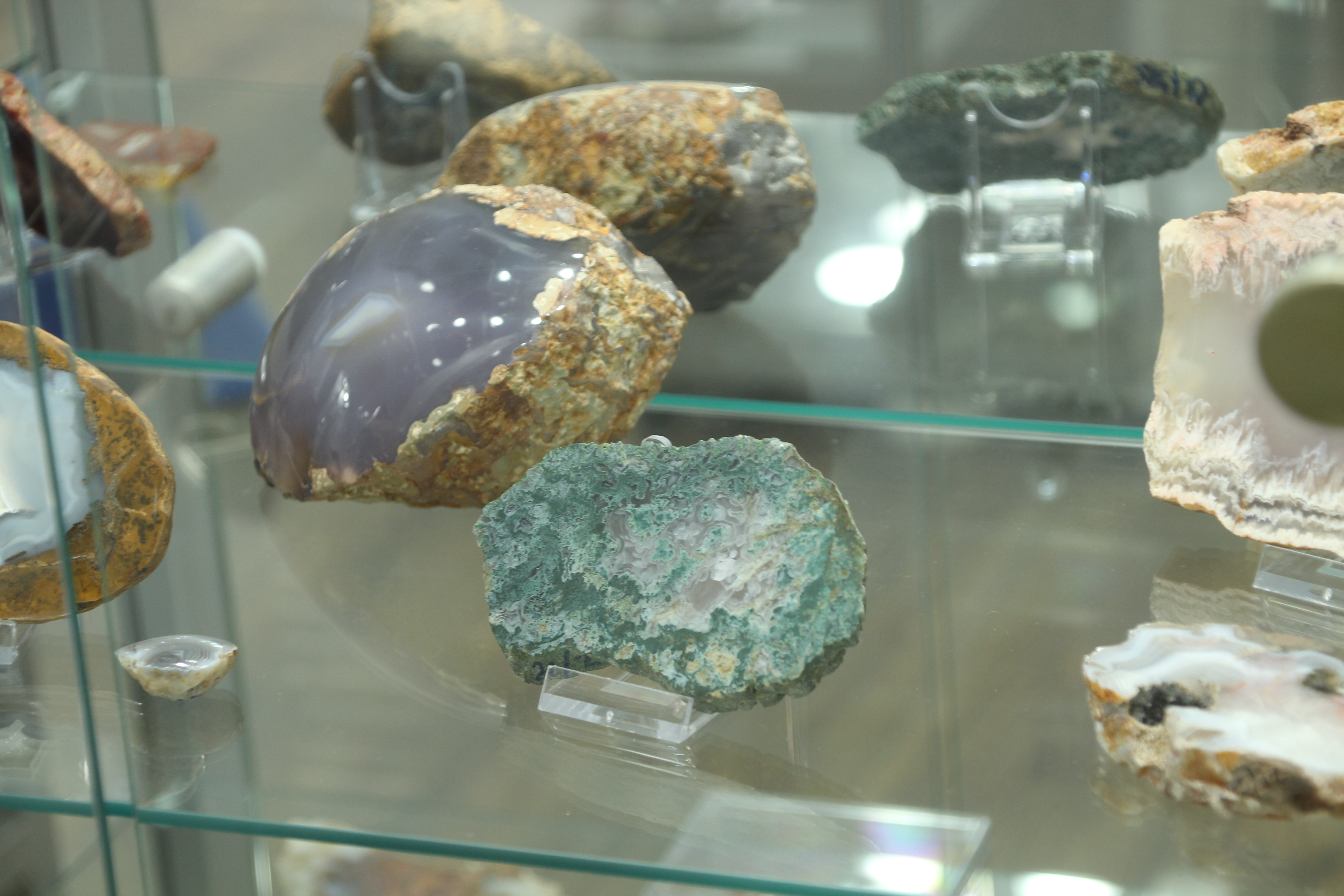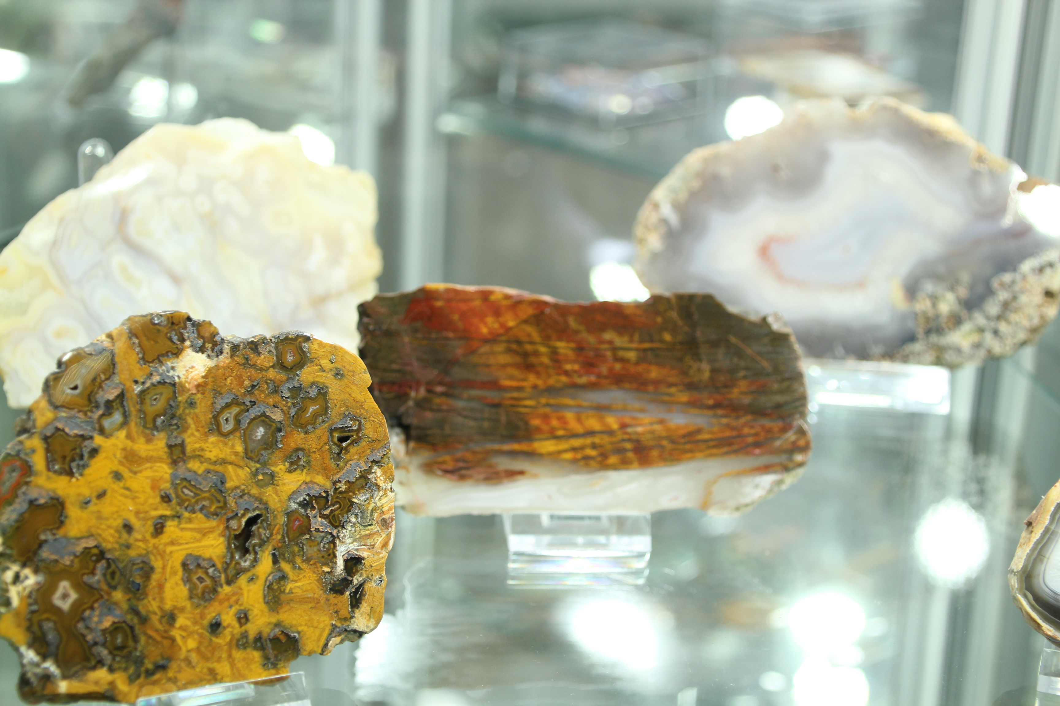 ochiul unui pasionat şi abilităţile unui expert pentru ca roca să se dezvăluie lumii. Dacă îl urmezi şi îl asculţi pe om, realizezi că, atunci când e vorba de minerale, accidentele sunt … fericite: „Asta e o septaria”, spune omul cu mâna peste un bolovan greoi şi mohorât al cărui mijloc adăposteşte un bulgăr verzui. „Sunt nişte accidente silicioase în calcare. Verdele din exterior este un mineral – celadonit – în vitrină, vedeţi piesele deja tăiate şi lustruite”. La un pas de piatra cenuşie cu miez verde, suratele ei îşi arată inimile de piatră în toată splendoarea – o geometrie de culori în care izbucnesc mici izvoare albe ce despart roca în insule cu nuanţe calde brune, roşcate şi verzui.