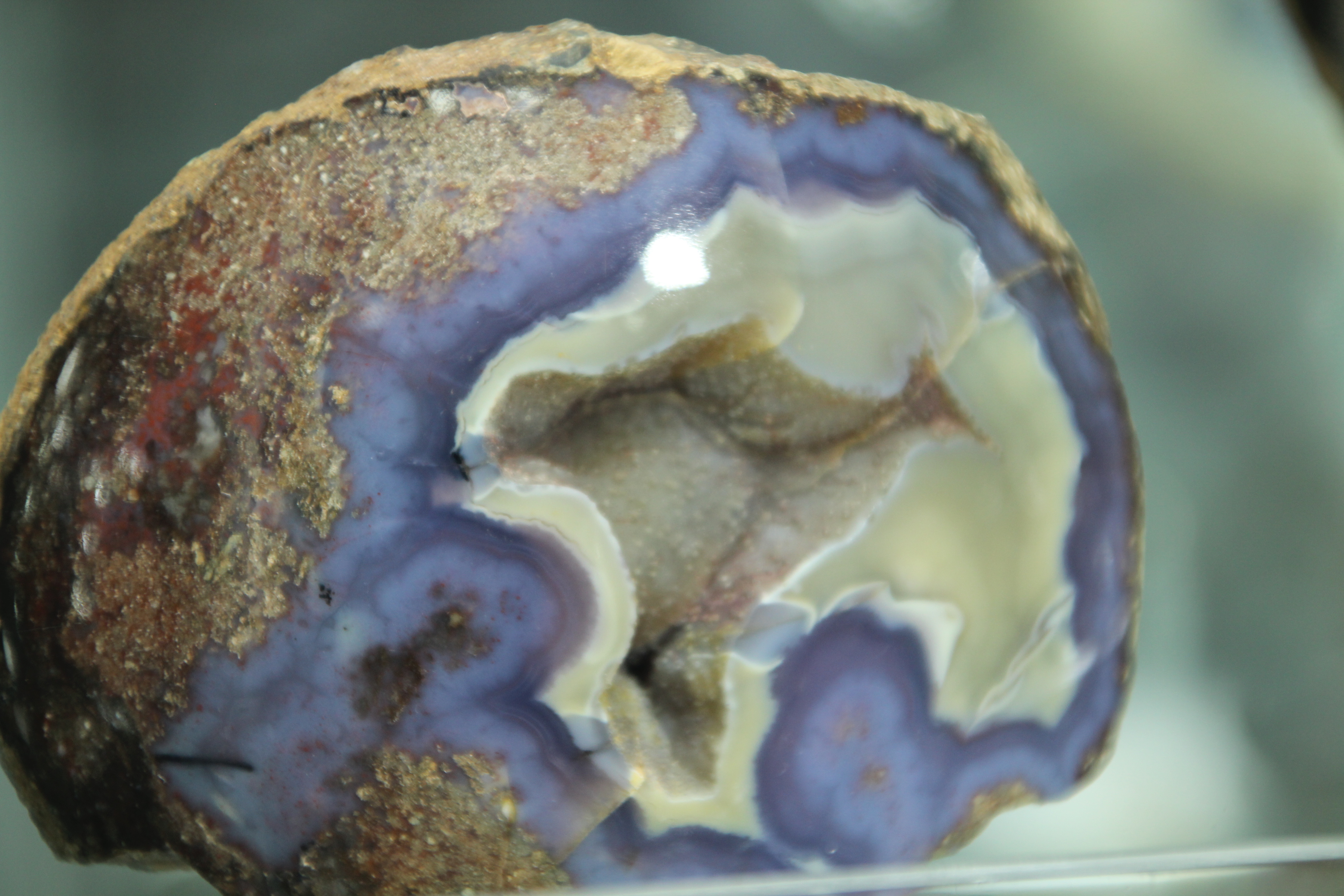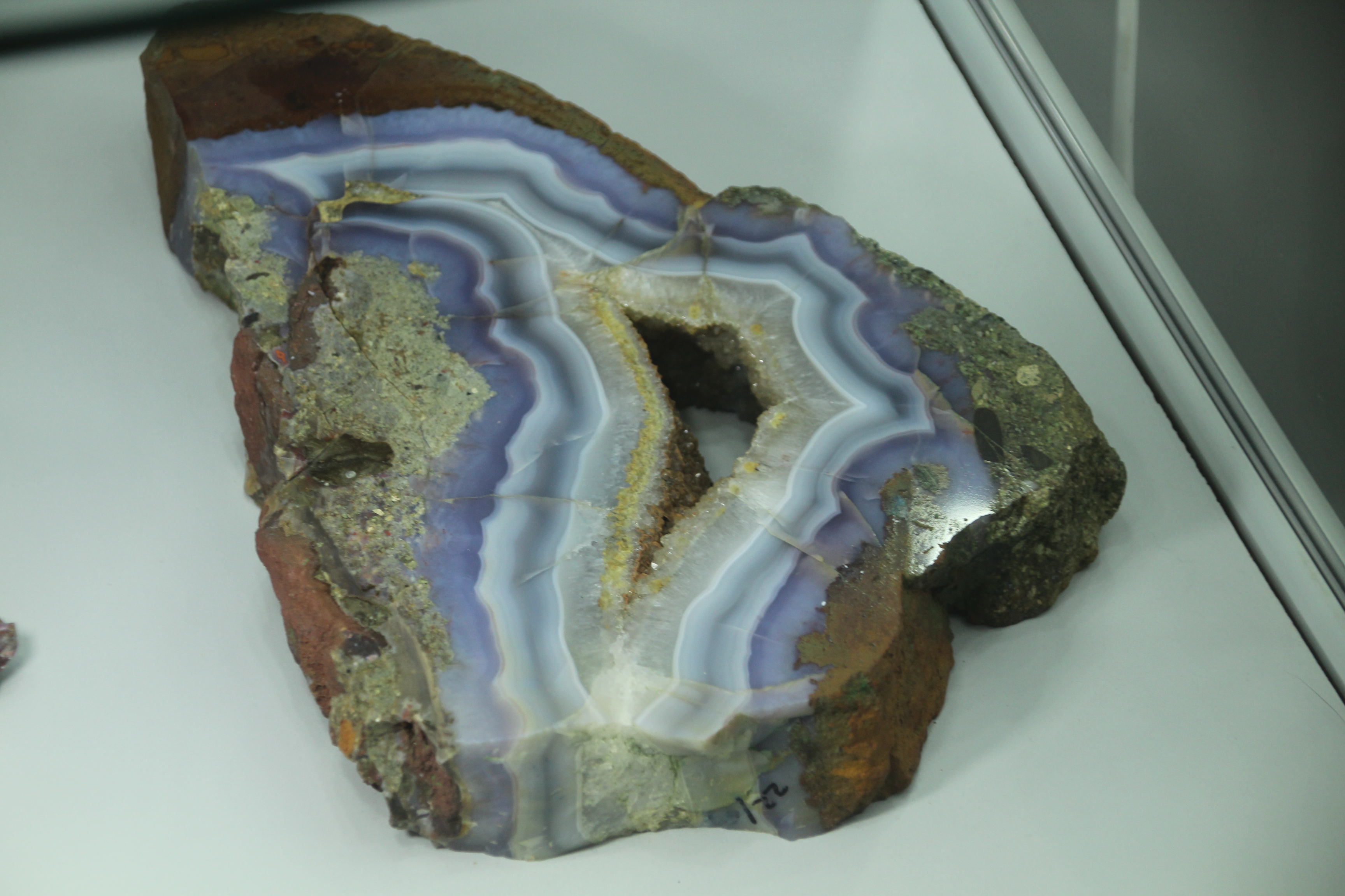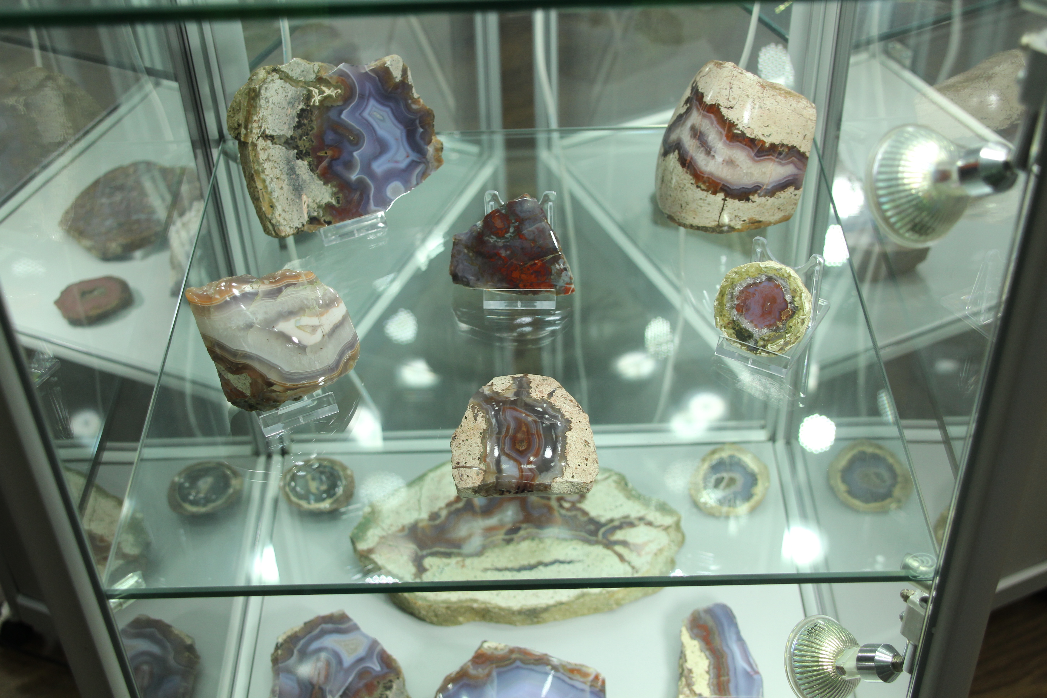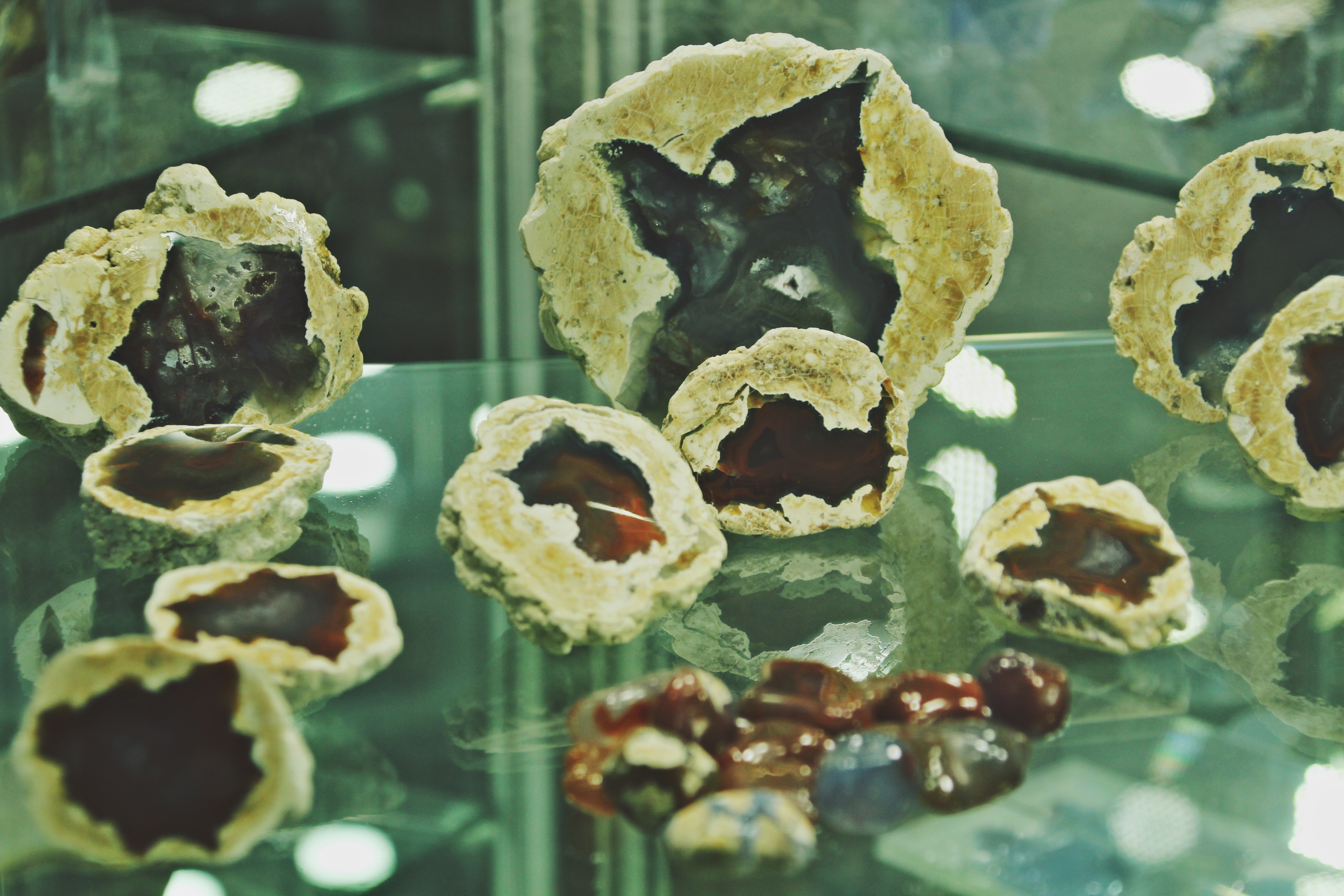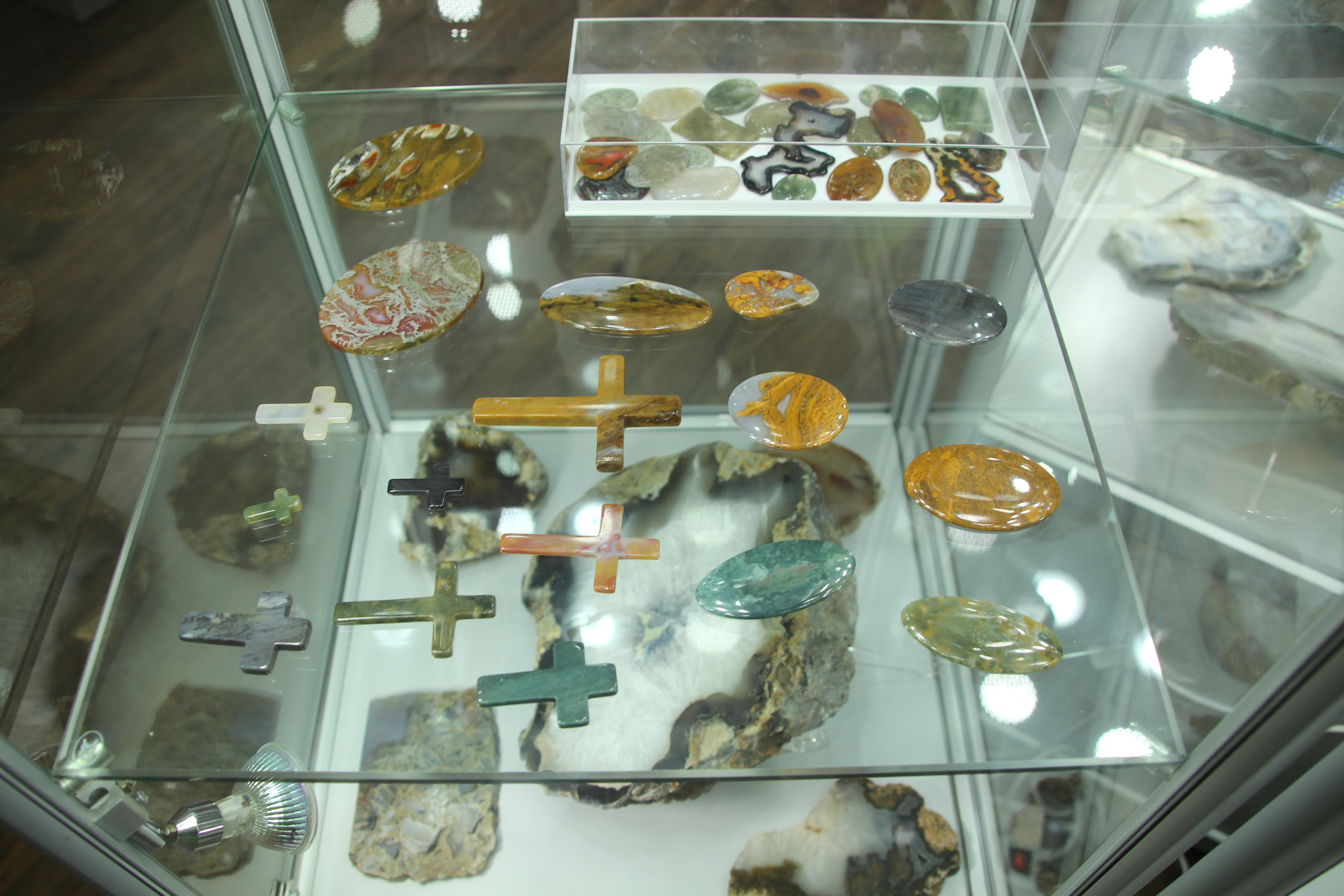 ochiul unui pasionat şi abilităţile unui expert pentru ca roca să se dezvăluie lumii. Dacă îl urmezi şi îl asculţi pe om, realizezi că, atunci când e vorba de minerale, accidentele sunt … fericite: „Asta e o septaria”, spune omul cu mâna peste un bolovan greoi şi mohorât al cărui mijloc adăposteşte un bulgăr verzui. „Sunt nişte accidente silicioase în calcare. Verdele din exterior este un mineral – celadonit – în vitrină, vedeţi piesele deja tăiate şi lustruite”. La un pas de piatra cenuşie cu miez verde, suratele ei îşi arată inimile de piatră în toată splendoarea – o geometrie de culori în care izbucnesc mici izvoare albe ce despart roca în insule cu nuanţe calde brune, roşcate şi verzui.