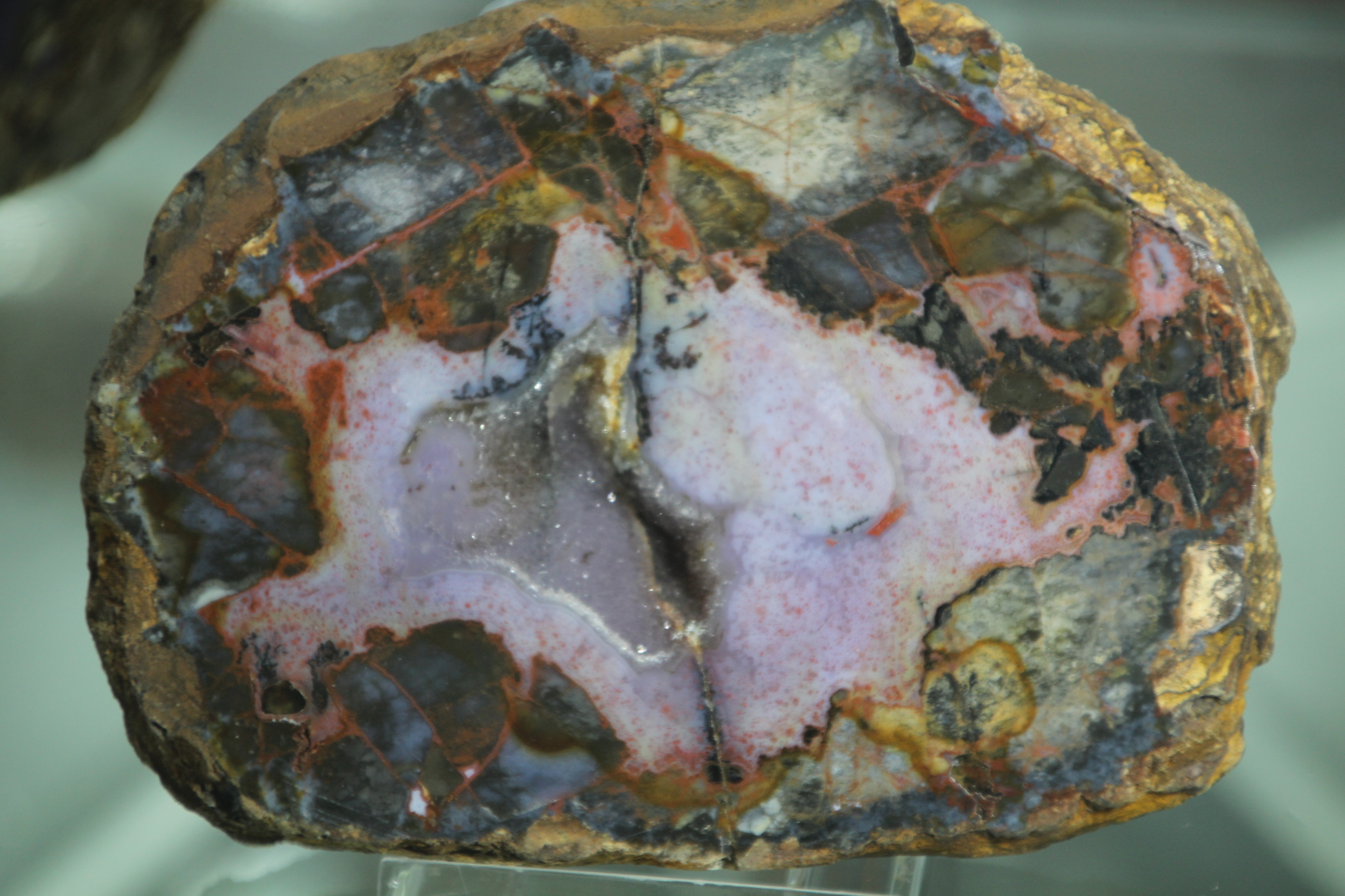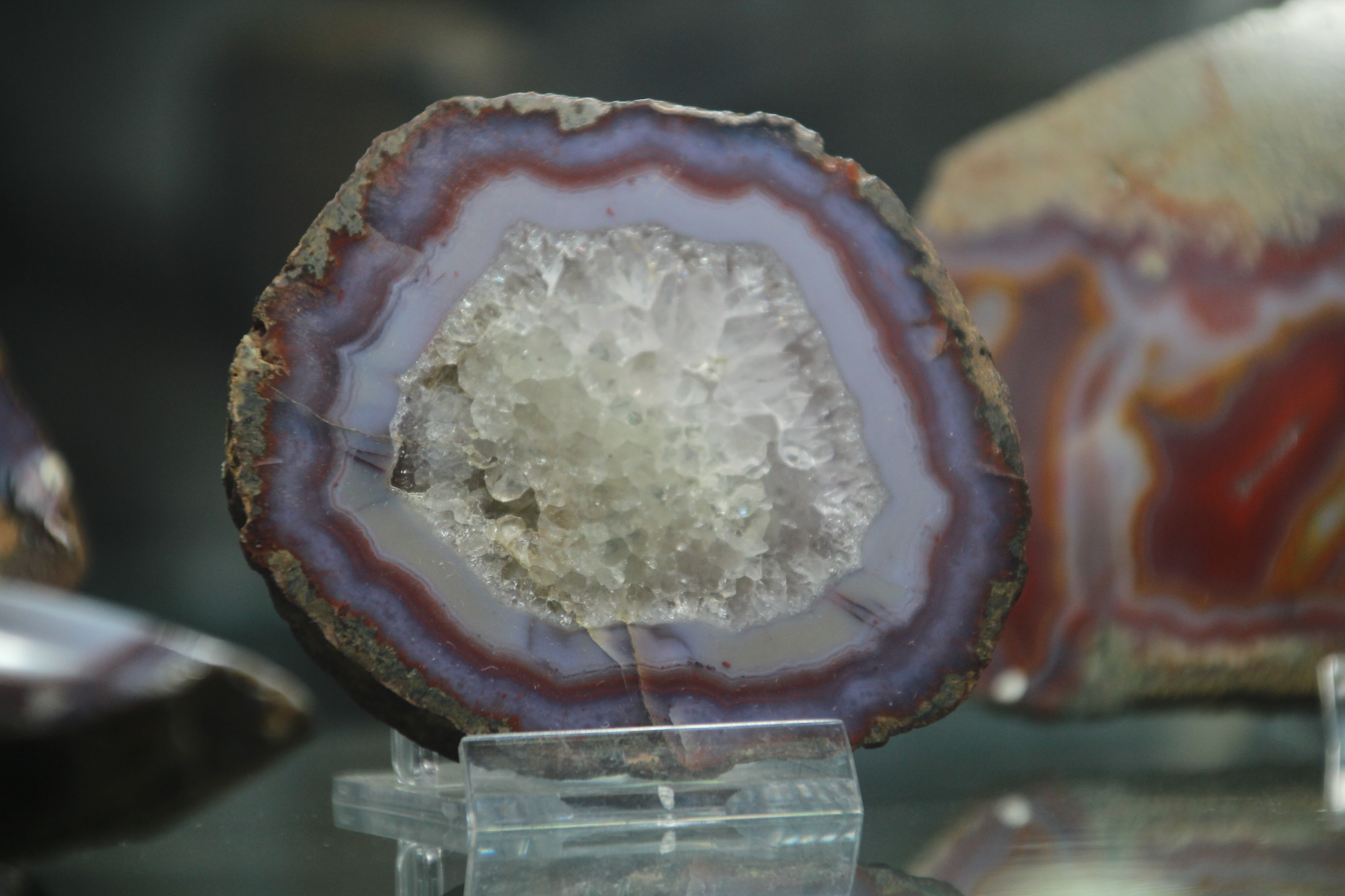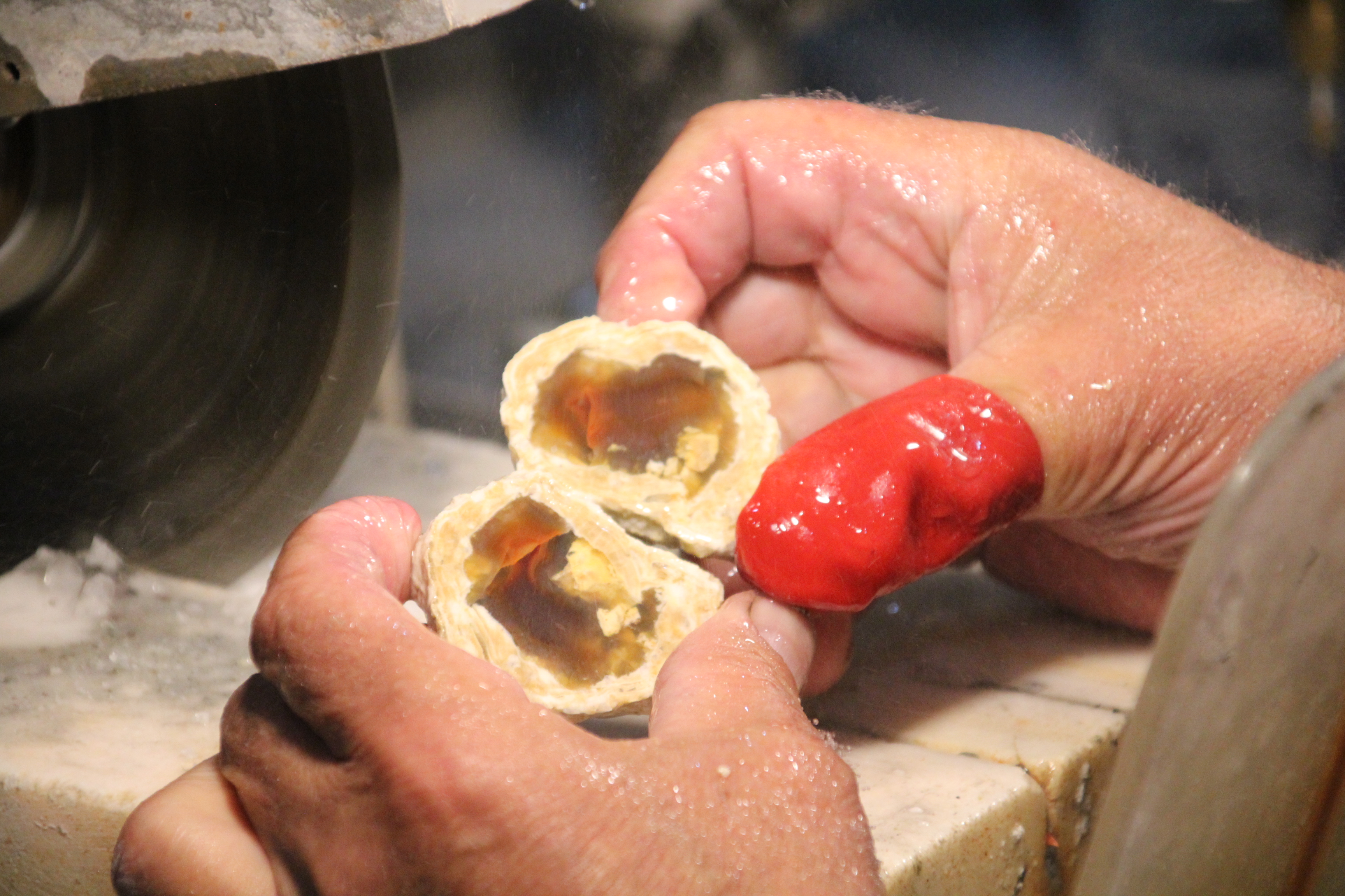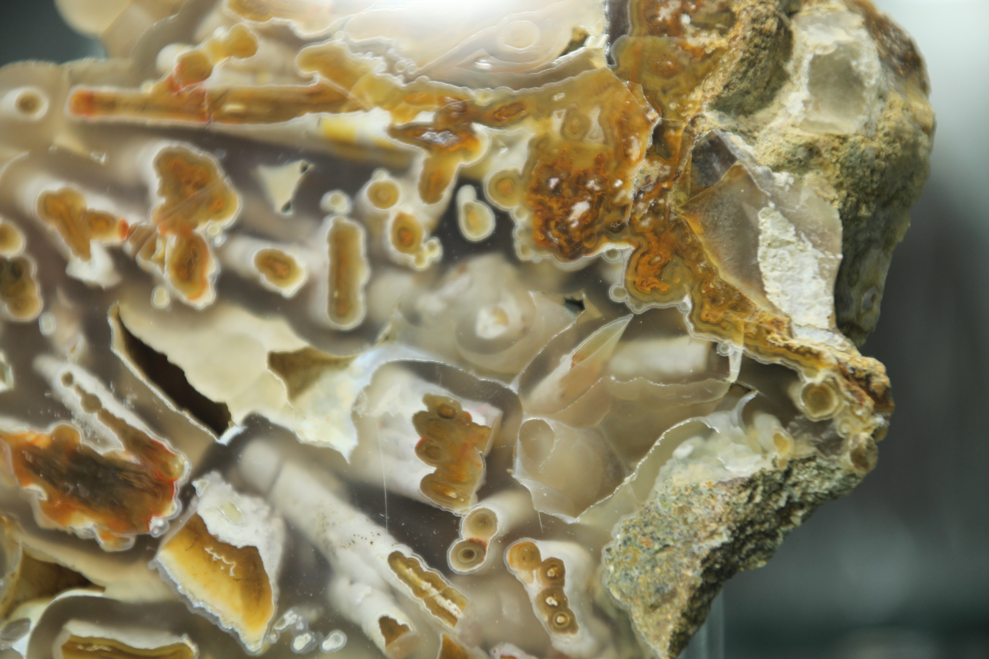 ochiul unui pasionat şi abilităţile unui expert pentru ca roca să se dezvăluie lumii. Dacă îl urmezi şi îl asculţi pe om, realizezi că, atunci când e vorba de minerale, accidentele sunt … fericite: „Asta e o septaria”, spune omul cu mâna peste un bolovan greoi şi mohorât al cărui mijloc adăposteşte un bulgăr verzui. „Sunt nişte accidente silicioase în calcare. Verdele din exterior este un mineral – celadonit – în vitrină, vedeţi piesele deja tăiate şi lustruite”. La un pas de piatra cenuşie cu miez verde, suratele ei îşi arată inimile de piatră în toată splendoarea – o geometrie de culori în care izbucnesc mici izvoare albe ce despart roca în insule cu nuanţe calde brune, roşcate şi verzui.
