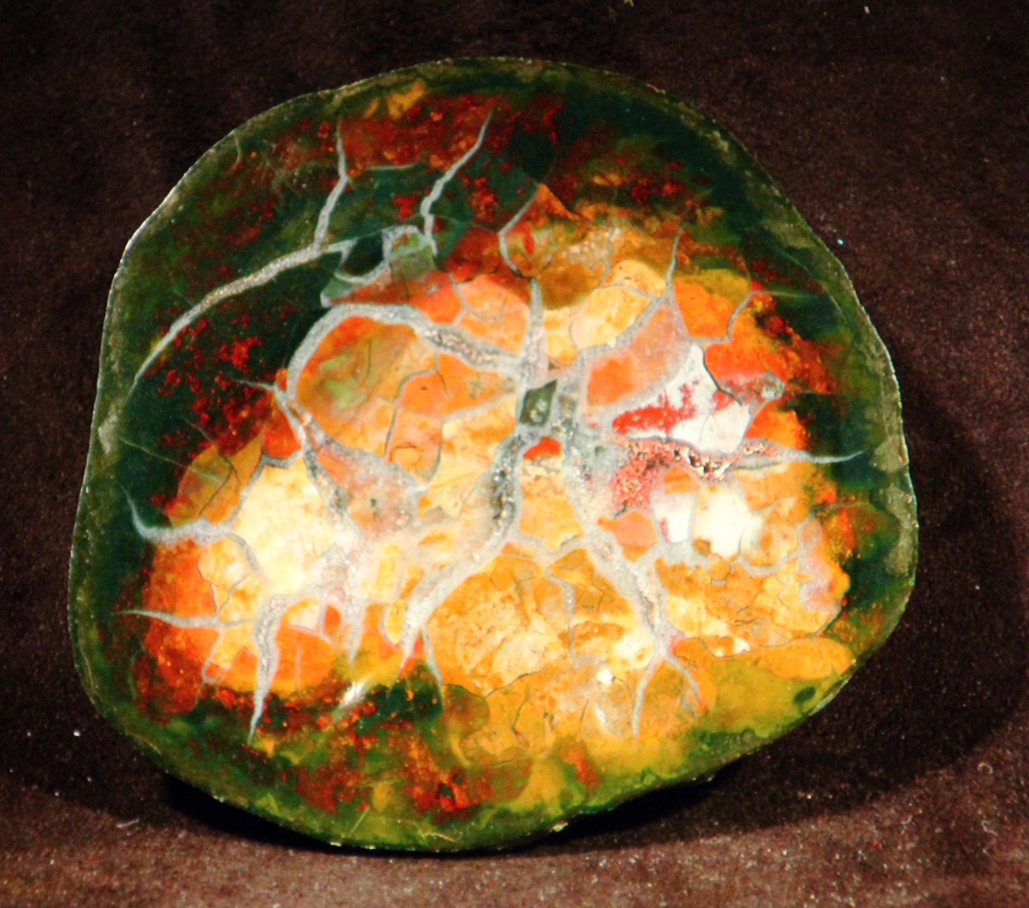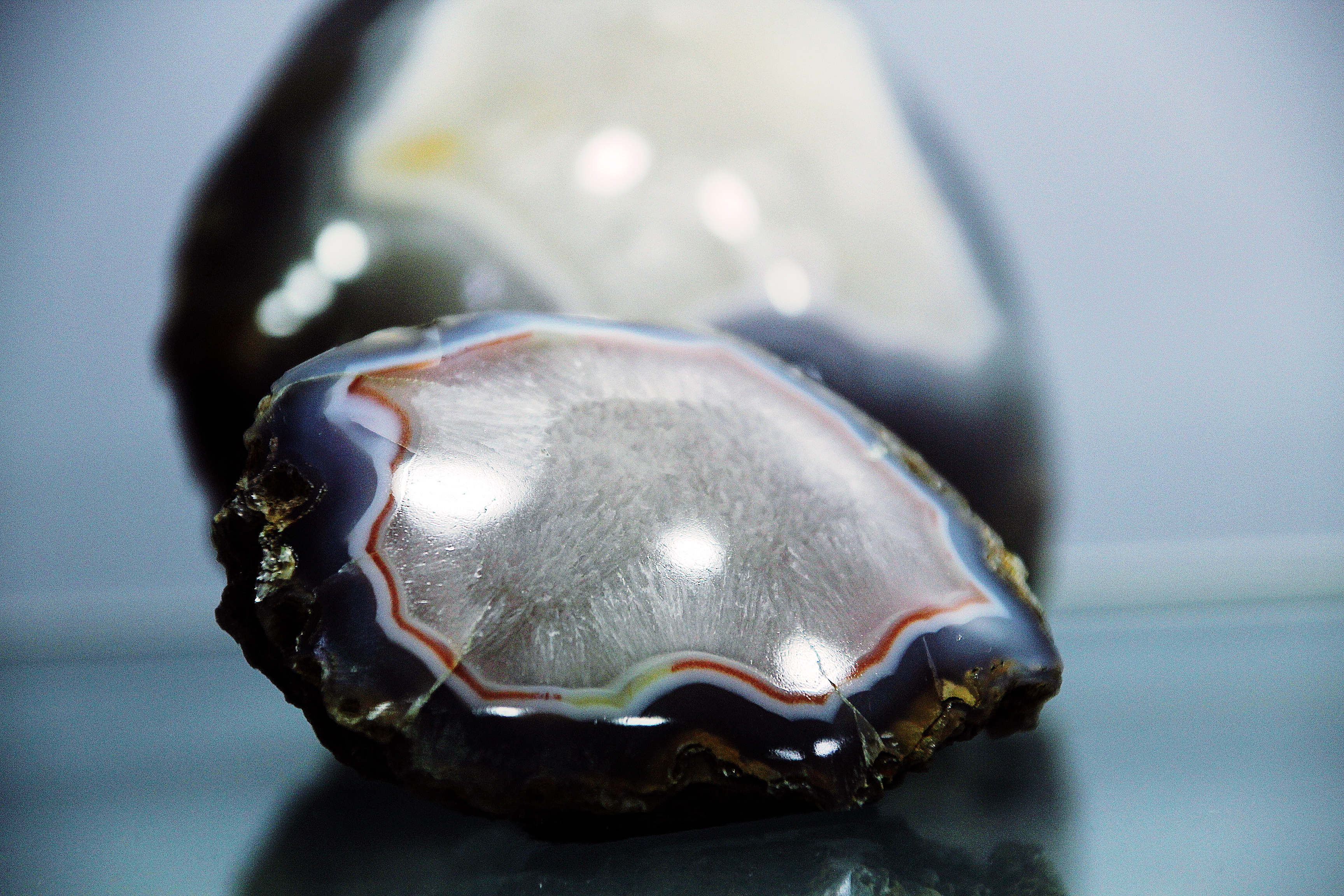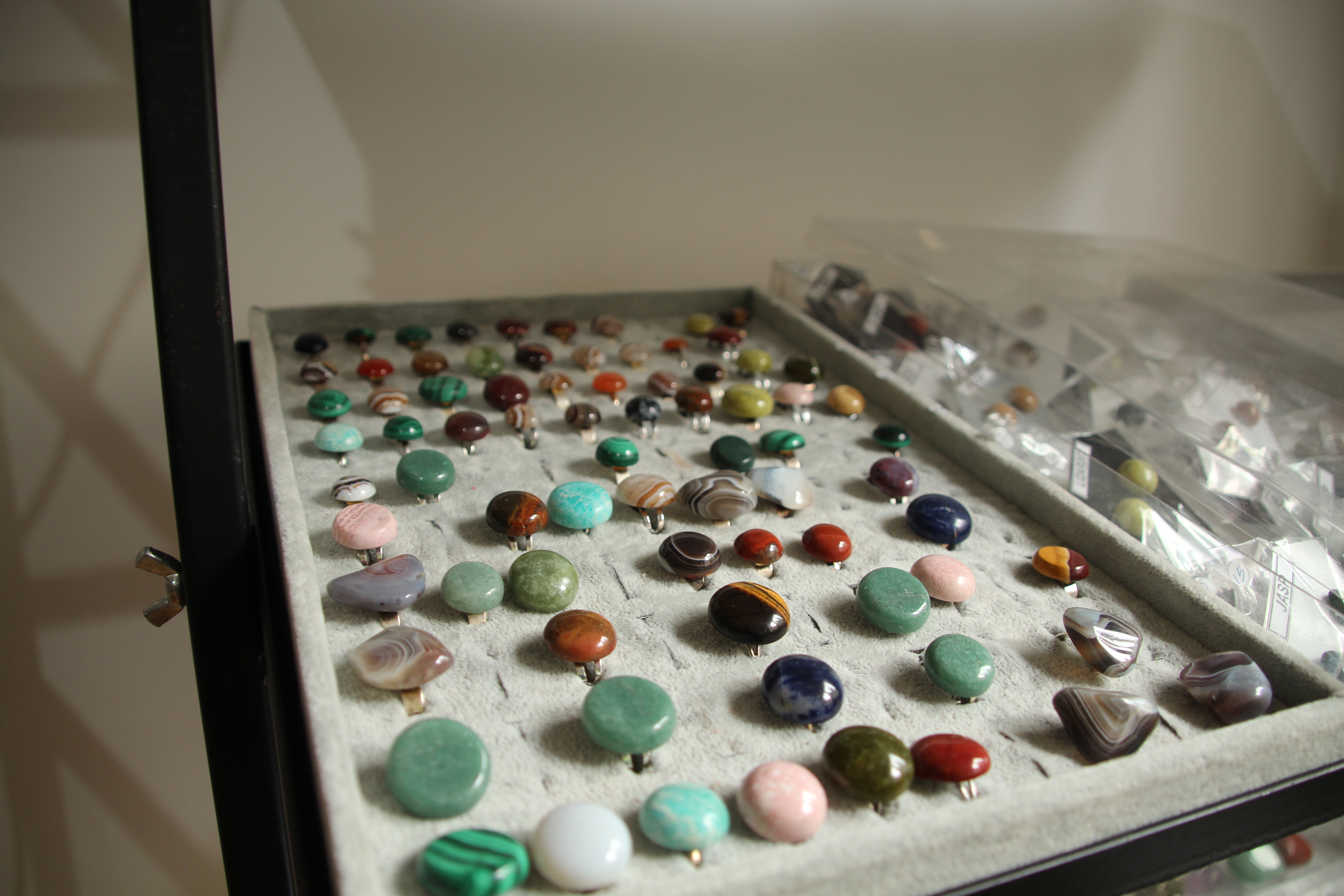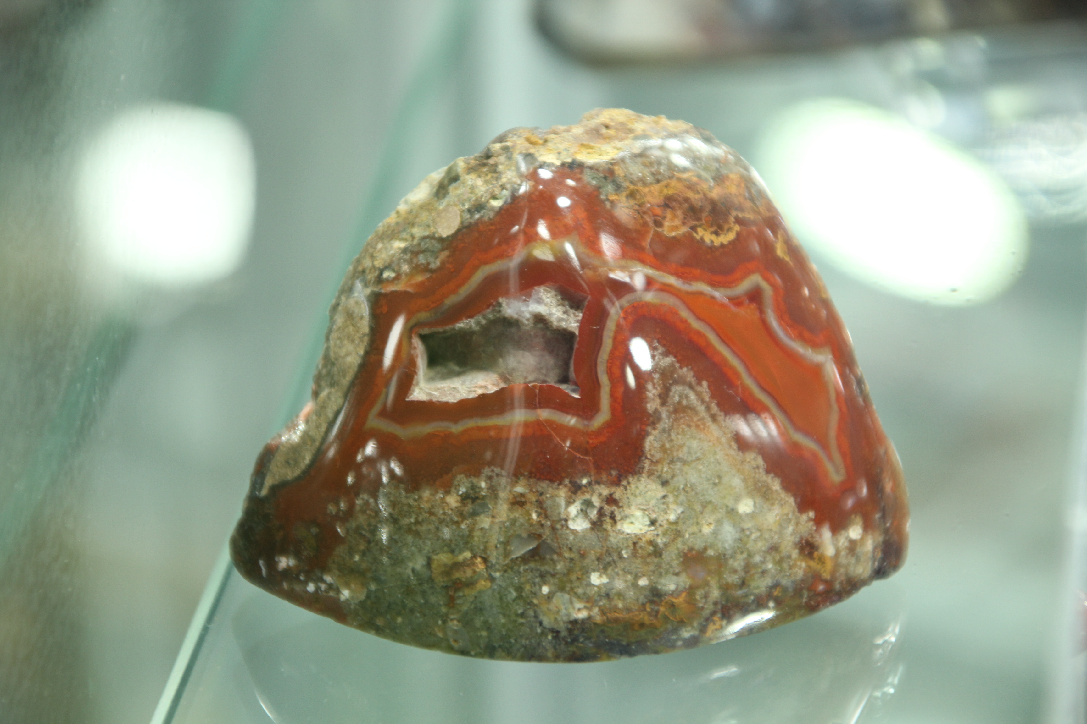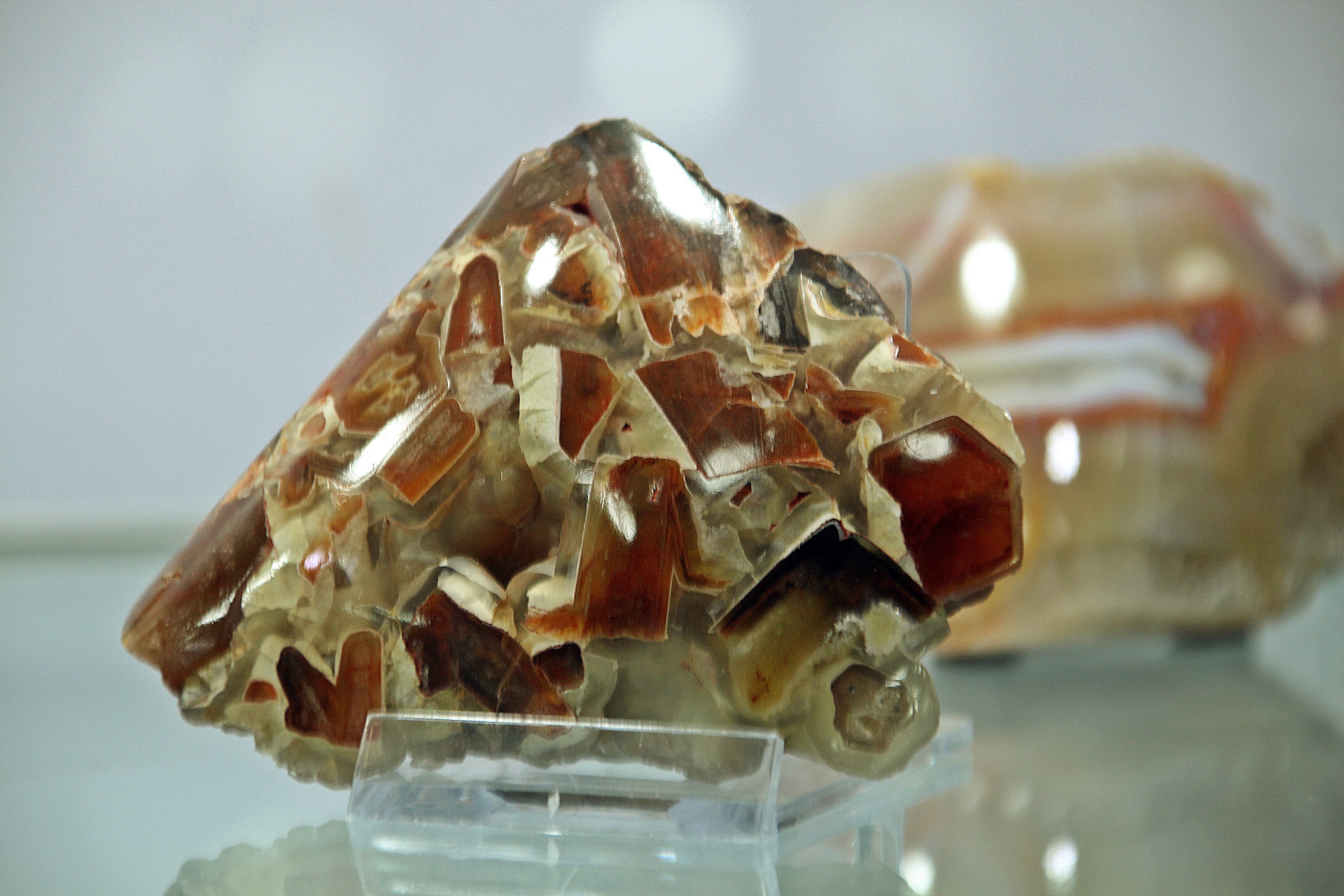 ochiul unui pasionat şi abilităţile unui expert pentru ca roca să se dezvăluie lumii. Dacă îl urmezi şi îl asculţi pe om, realizezi că, atunci când e vorba de minerale, accidentele sunt … fericite: „Asta e o septaria”, spune omul cu mâna peste un bolovan greoi şi mohorât al cărui mijloc adăposteşte un bulgăr verzui. „Sunt nişte accidente silicioase în calcare. Verdele din exterior este un mineral – celadonit – în vitrină, vedeţi piesele deja tăiate şi lustruite”. La un pas de piatra cenuşie cu miez verde, suratele ei îşi arată inimile de piatră în toată splendoarea – o geometrie de culori în care izbucnesc mici izvoare albe ce despart roca în insule cu nuanţe calde brune, roşcate şi verzui.