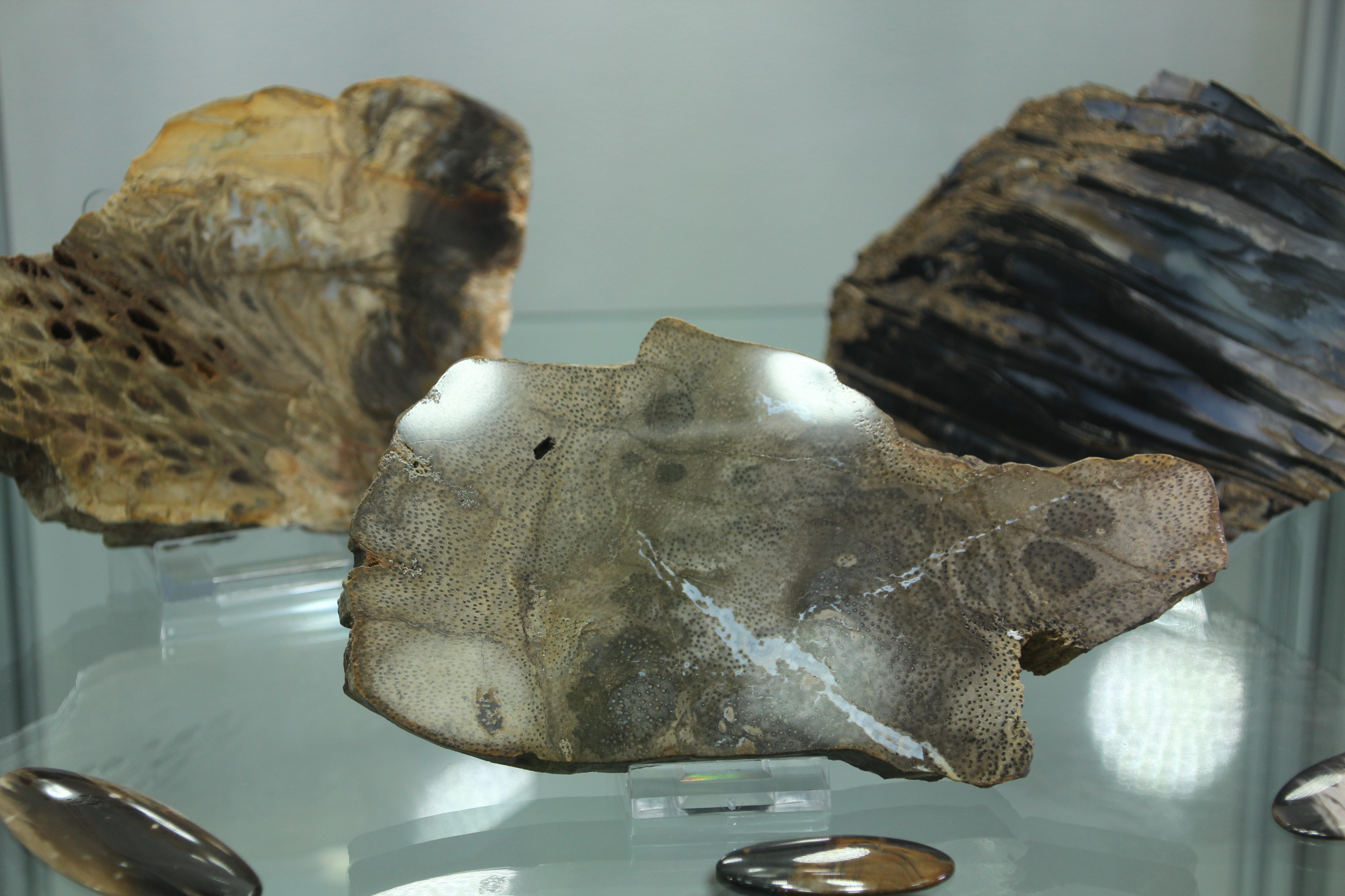 Aşa că mergem „dincolo, la lemne”. Într-o vitrină, câteva felii de rocă ascund poveşti incredibile: „Astea sunt lemne silicifiate de pe Valea Mureşului, din zona Gurasada, Ilia, Burjuc, Tătărăşti. Ele sunt impregnate cu bioxidul de siliciu şi devin piatră, doar desenele au mai rămas”. Structura lemnului a rămas prinsă în piatră. Butucii au devenit minerale. „Vă pot arăta nişte lemne, de la Almaşu Mic de Munte”, zâmbeşte Toda şi arată către câteva piese ciudate, care numai lemne autohtone nu par: „Este un soi de palmier, iar lângă el este un cycadeoid. Ele sunt specii tipice climei tropicale. Se vede în piatră structura specifică palmierului – lipsa inelelor de creştere arată că nu exista alternanţă vară- iarnă. Era clima tropicală din urmă cu 9-10 milioane de ani, de aici”.