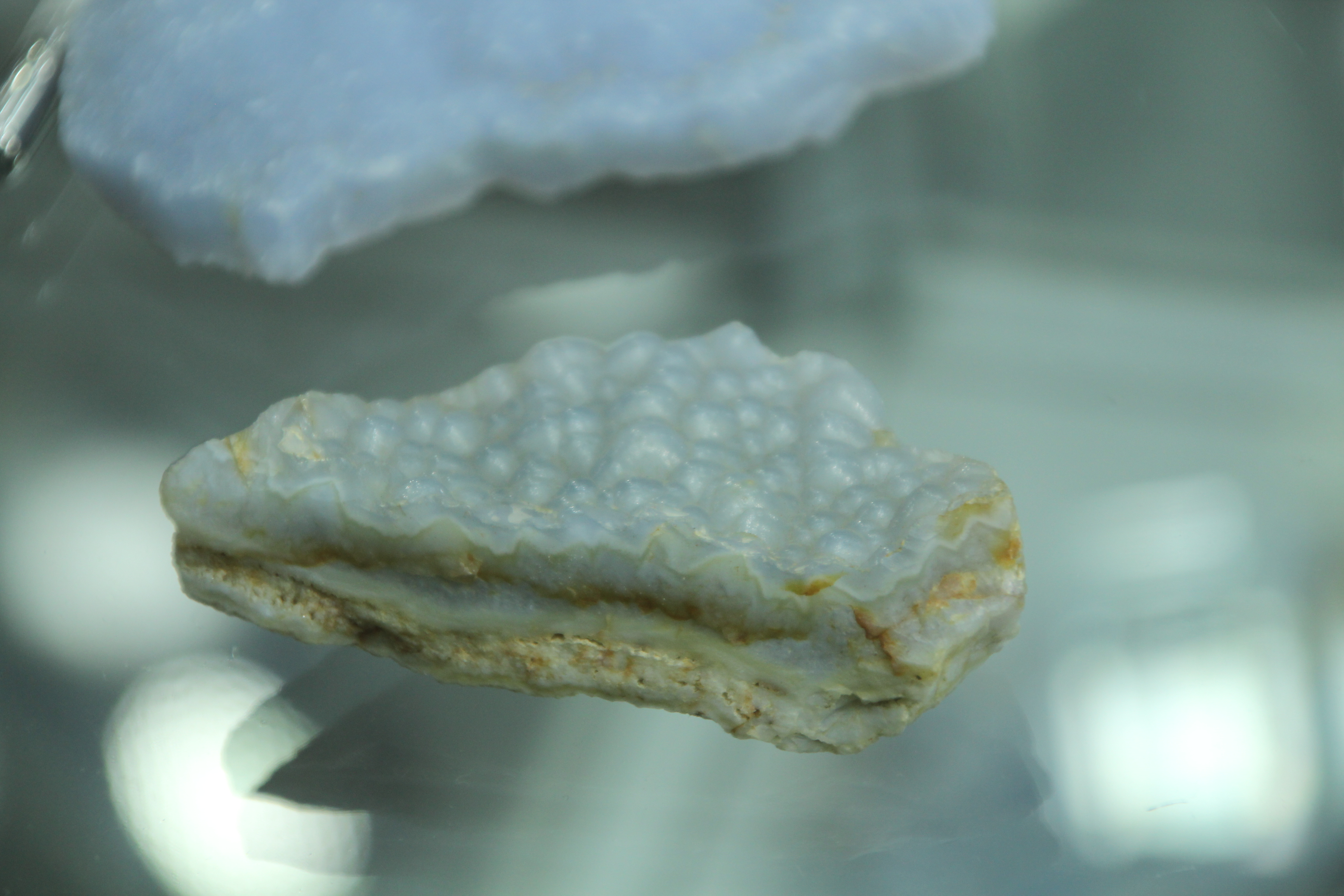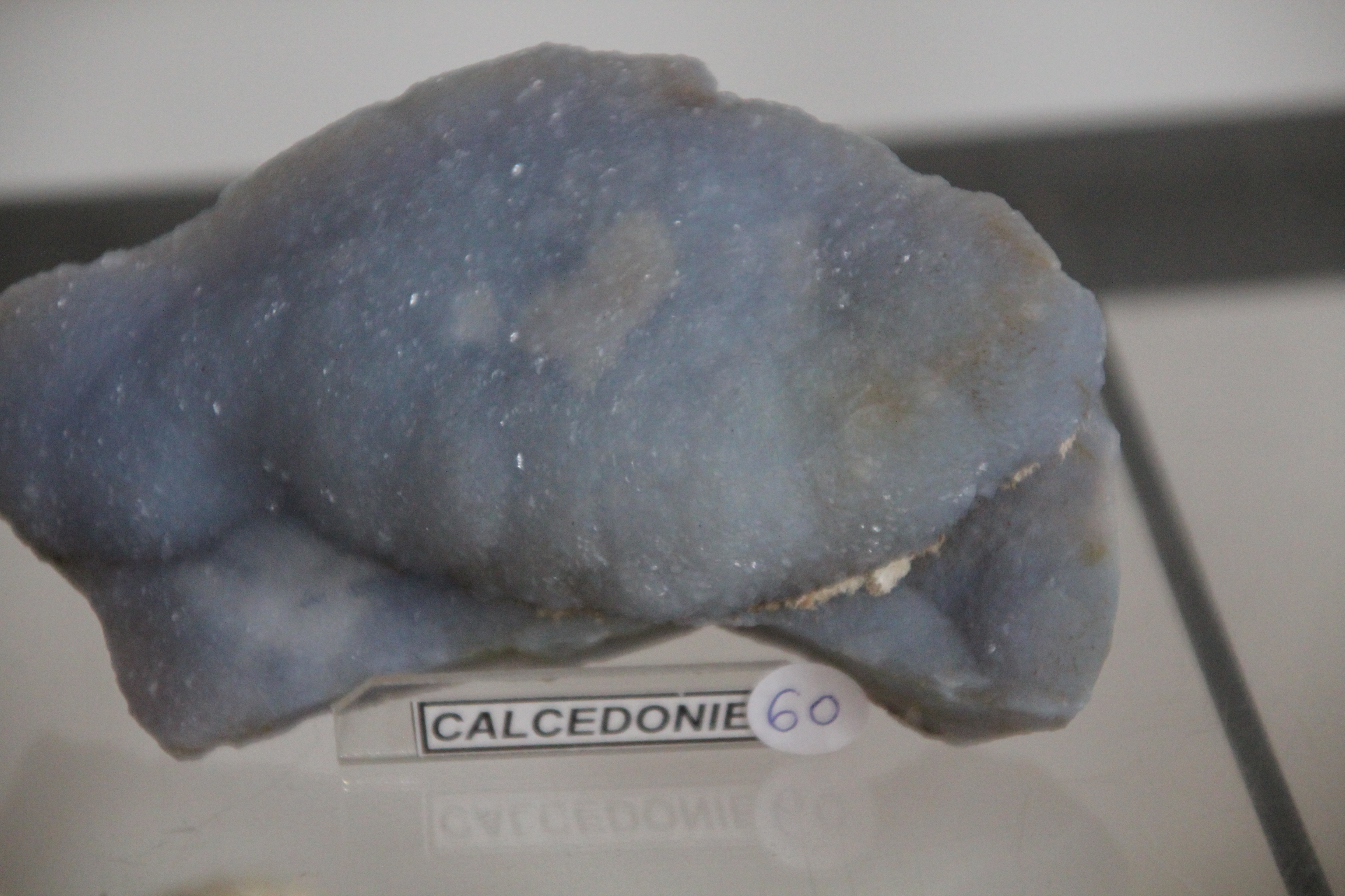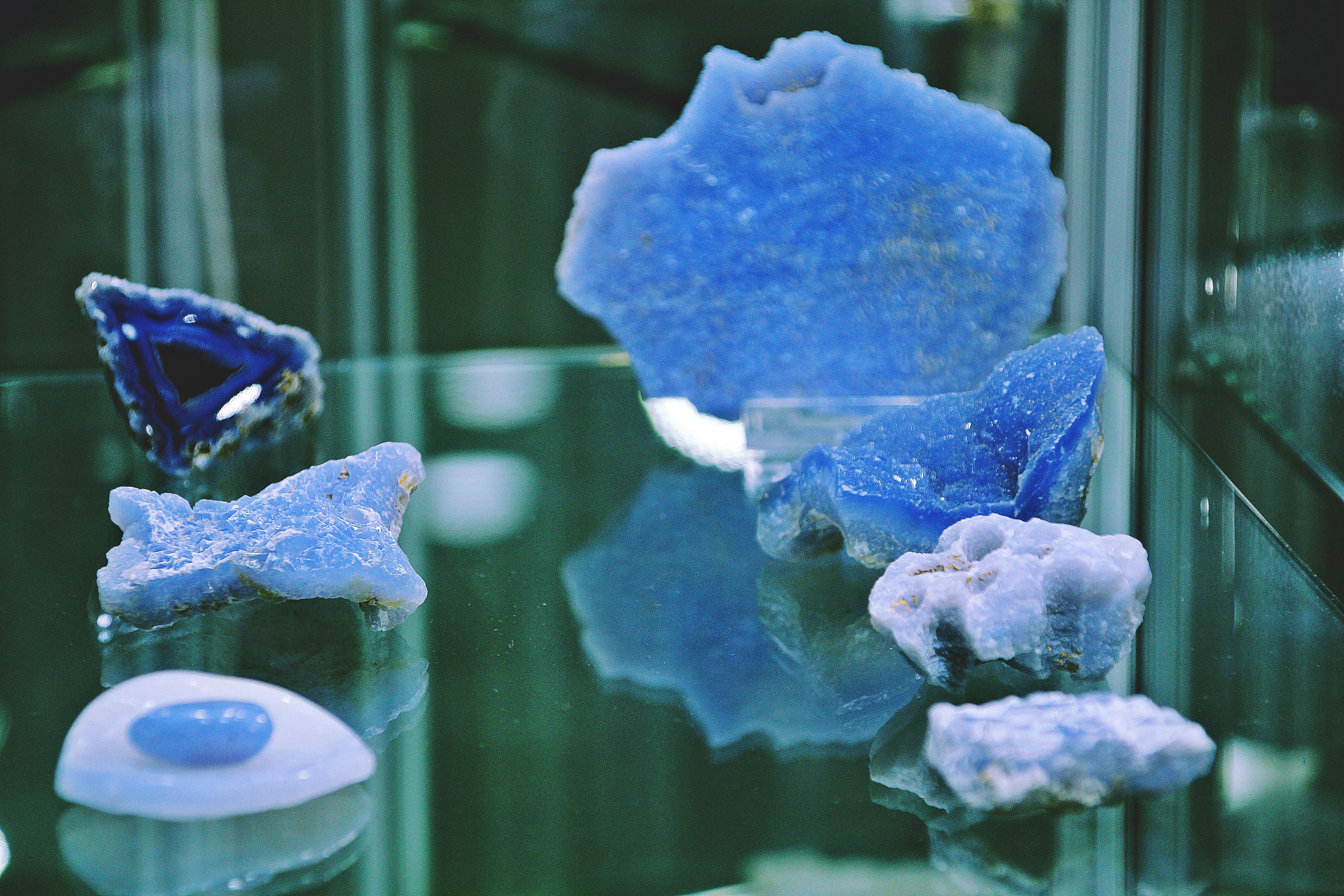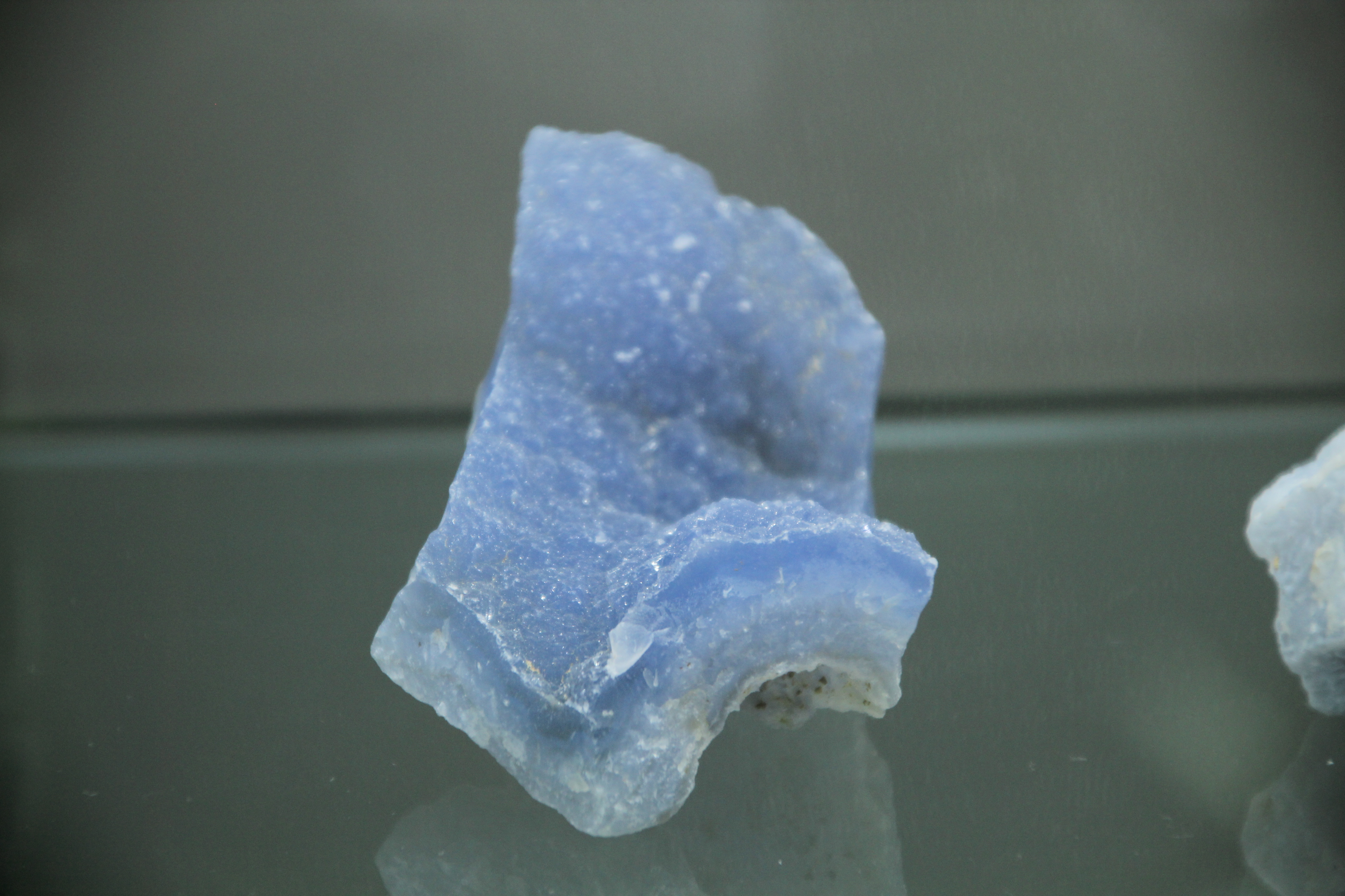 Calcedonia albastră te duce cu gândul la cerul verii şi nuanţele diluate ale cernelii. Când le priveşti, parcă te-ai uita de undeva din cer către mare: ai vedea puhoiul de nuanţe albăstriii mărginite pe ţărmul nisipos. Piatra semipreţioasă se găseşte la Trestia, în Maramureş. „Este o varietate care la un moment dat cristalizează, e tot un bioxid de siliciu, dar are potasiu şi sodiu în formula chimică. În urmă cu 40 de ani, la Trestia, le găseam în râu, ultima dată când am fost le-am cumpărat de la săteni. S-au învăţat şi le adună, apoi le comercializează ei. Se folosesc ca materie primă pentru medalioane, alte bijuterii.”