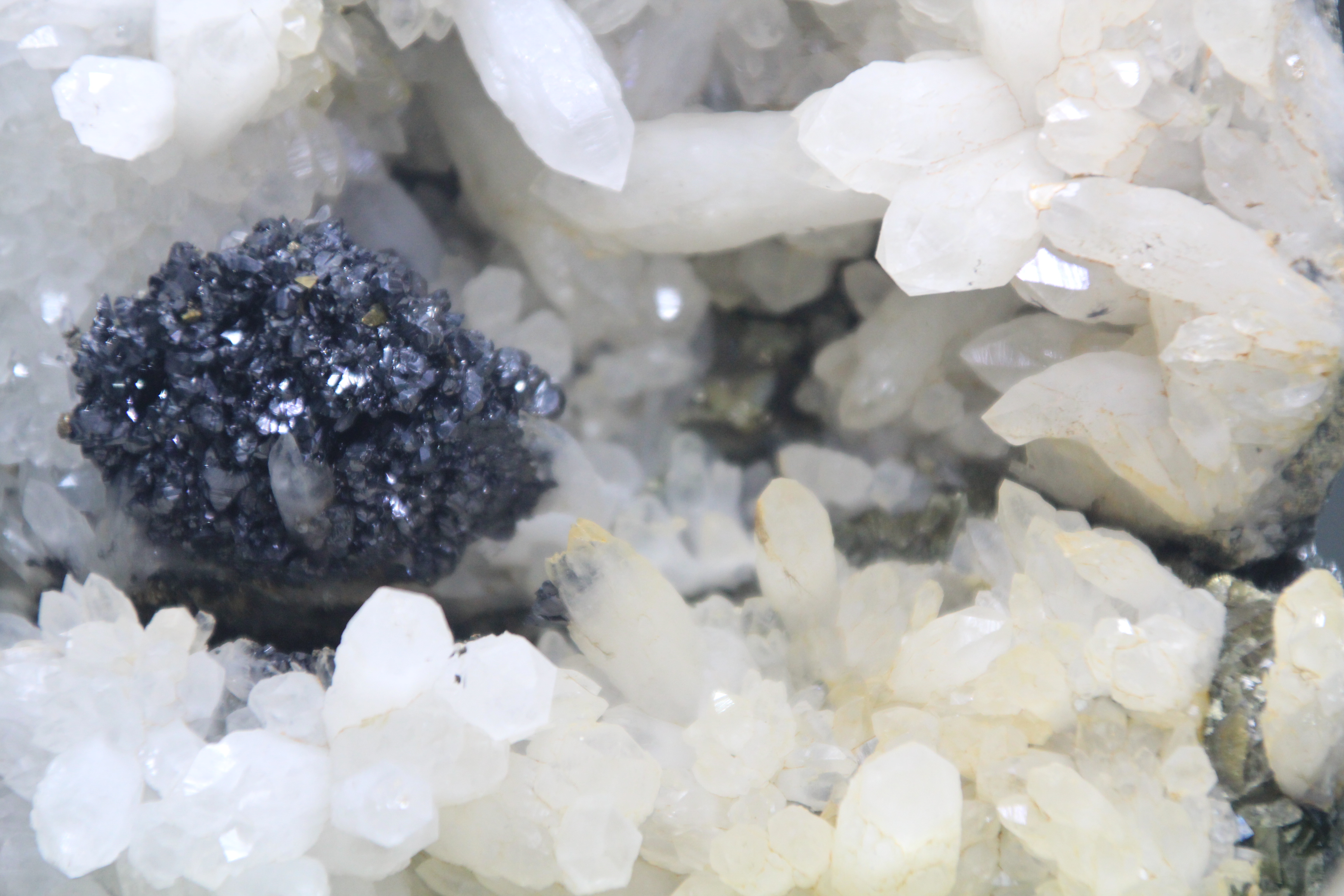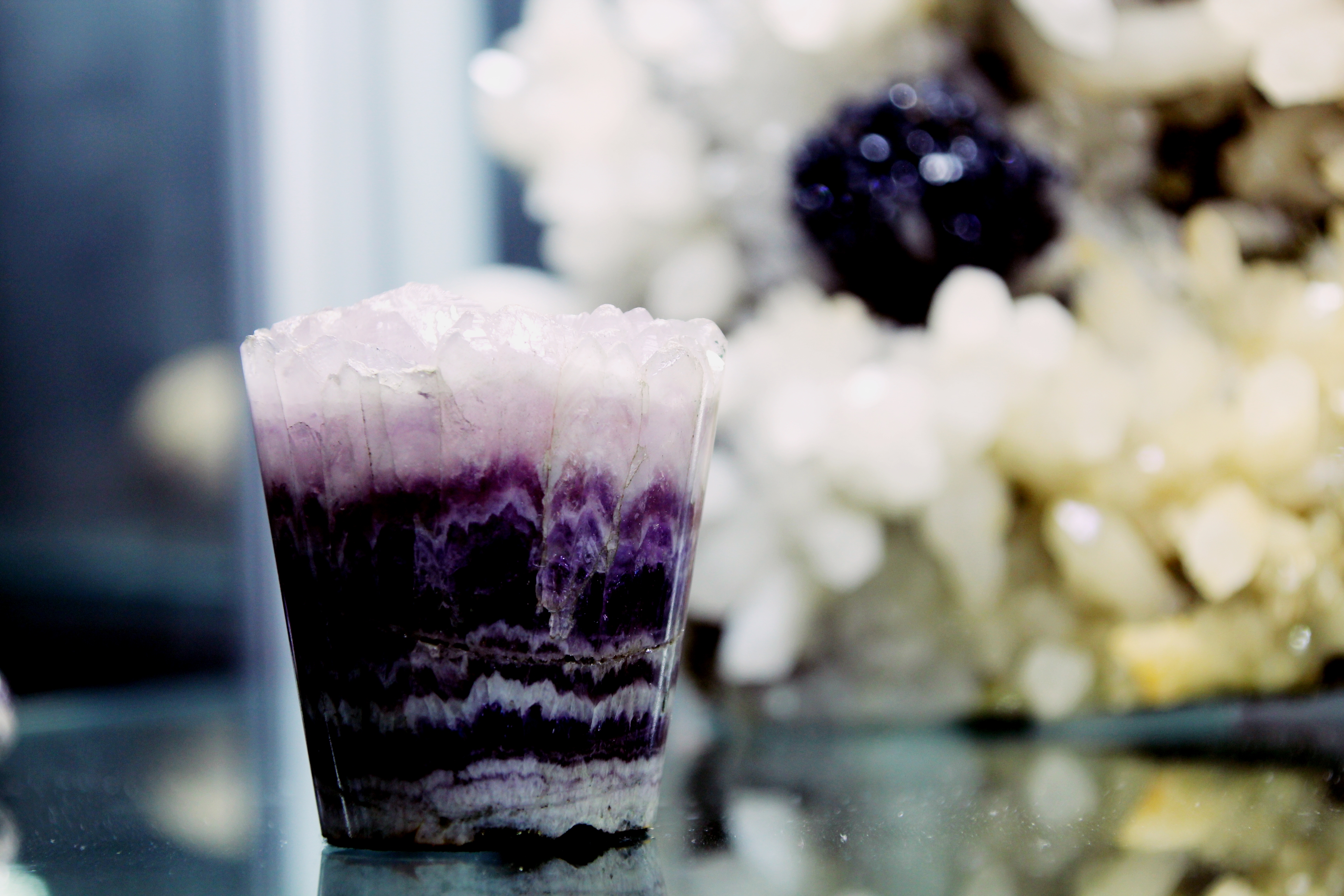 Alături sunt aranjate diamantele româneşti de Maramureş – câteva pietricele micuţe cât gămălia de chibrit – „sunt cuarţuri bipiramidale şi foarte transparente. Se găsesc într-un sedimentar – e roca în care sunt găzduite”, explică colecţionarul. „Diamantul de Maramureş” nu e din carbon, ci este practic un cristal de cuarţ. Are dimensiuni mici de până la 10 mm. Te impresionează însă puritatea mineralului. Micile „diamante” sunt precum o apă limpede, au feţe perfecte, care strălucesc şi reflectă lumina. Alături işi expun frumuseţea violetă câteva piese grozave de ametist, inclusiv o coroană de cuarţuri movulii.