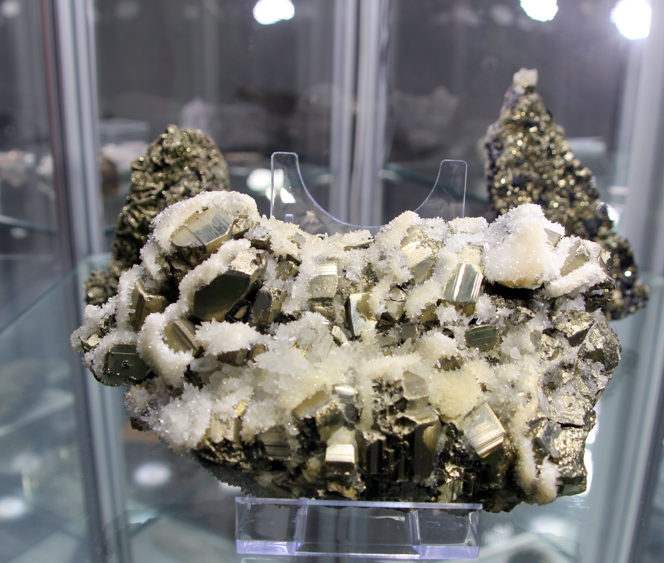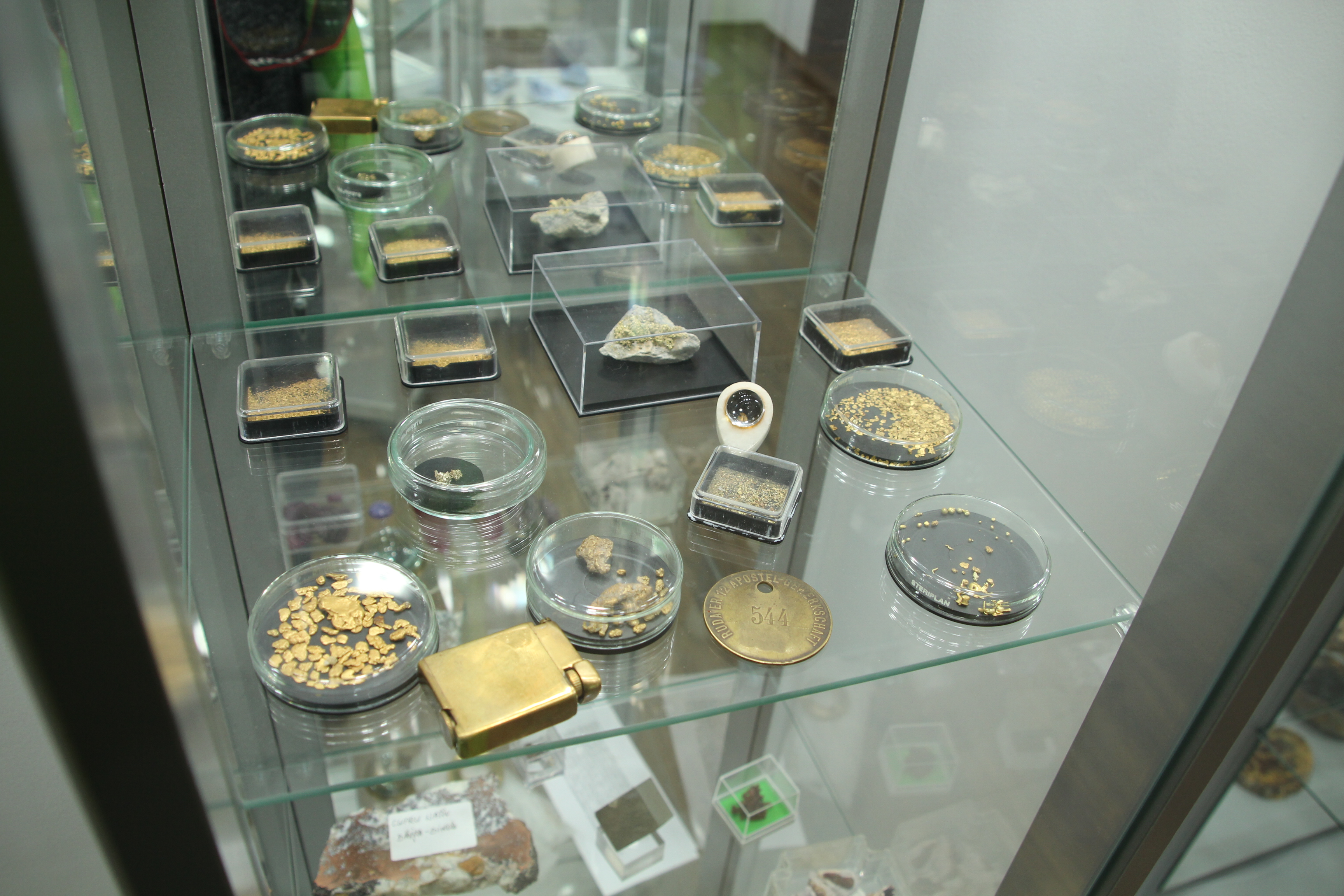 Un alt colţ al vitrinelor e dedicat „Aurului nebunilor” – aici sunt câteva pirite spectaculoase scoase din mină în urmă cu un veac. Culoarea metalică e pirita, adică sulfura de fier: „Sunt din zona Bucium, lângă, e o marcasită de la Baia de Arieş, alături sunt nişte cristale de cuarţ, majoritatea din zona Băii Mari. Cea galbenă, cu oxid de fier, e de la Valea Arsului, de la Criscior. Era aici o mină care acum s-a închis”.