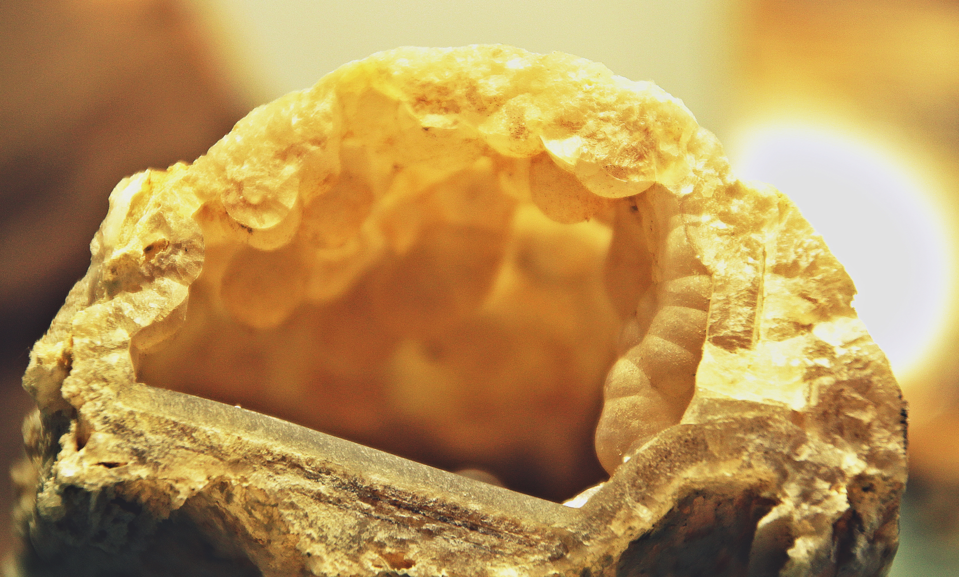 În altă piesă, nişte ciuperci ciudate par încremenite: „Sunt cristale de calcit, peste ele a venit calcedonia, pe urmă acizii humici cu apa au dizolvat cristalele respective şi, în locul lor, a venit o altă generaţie de calcedonia. Asta dă formele acestea geometrice. E o poveste pe care bărbatul o spune în câteva minute, deşi procesul a durat milioane de ani după stingerea vulcanilor. „După ce un vulcan erupe, se creează nişte goluri – bule de gaze – care, ulterior, cu surplus de silice, sunt umplute. Este asemănător cu procesul lemnelor silicifiate. Ele sunt acoperite de cenuşă, nu au acces la apă şi oxigen să putrezească şi se subtituie materiei organice. Se poate astfel stabili şi specia de lemn”, ne încredinţează Petru Toda.