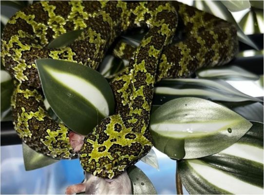 În apartament s-au descoperit 13 şerpi, 2 vipere de groapă Mangshan (Protobothrops mangshanensis – specie CITES Anexa II), un piton, un varan cu pete galbene, dar şi tarantule şi o ţestoasă cu picioare roşii.