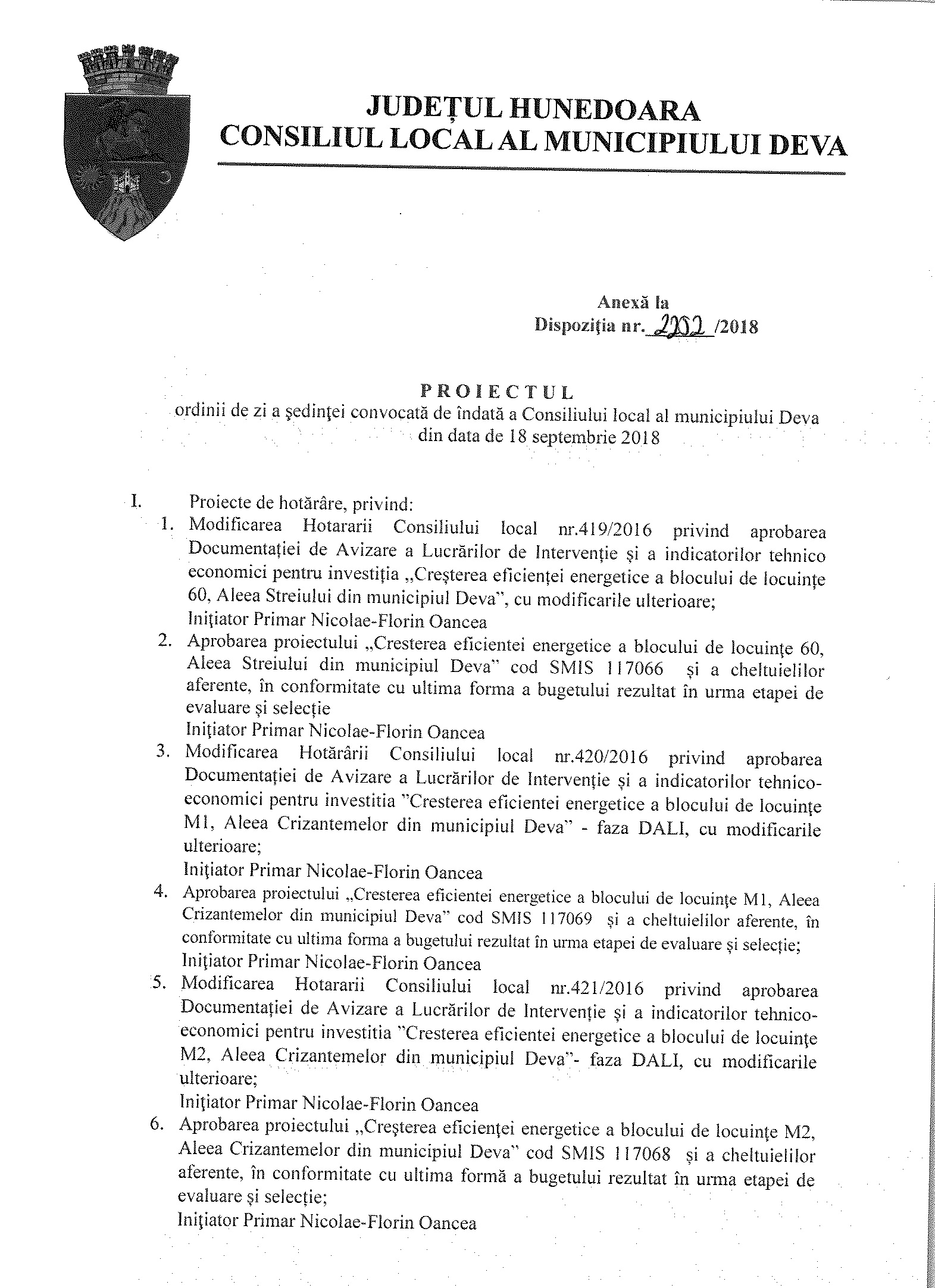 Primăria Municipiului Deva vă invită, marți, 18 septembrie 2018, la ora 14:00, la ședința convocată de îndată a Consiliului Local Deva, care va avea loc în sala de ședințe a instituției (etajul I).