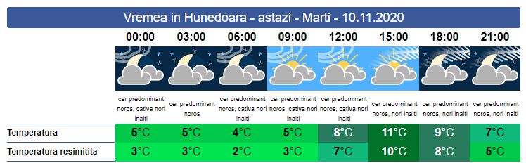 Marți, temperaturile se încadrează în normalul perioadei. Soarele răsare la ora 07:20. Dimineața, în depresiuni și zonele joase vremea se anunță închisă, cu ceață densă, iar fenomenul de burniță va fi prezent pe aproape tot parcursul zilei. În zonele montane, temperaturile vor fi foarte rece, dar cerul va fi senin. Soarele apune la ora 17:04. Vântul va sufla slab spre moderat. Temperaturile minime se vor încadra între 3-5 grade, iar cele maxime între 9-11 grade.