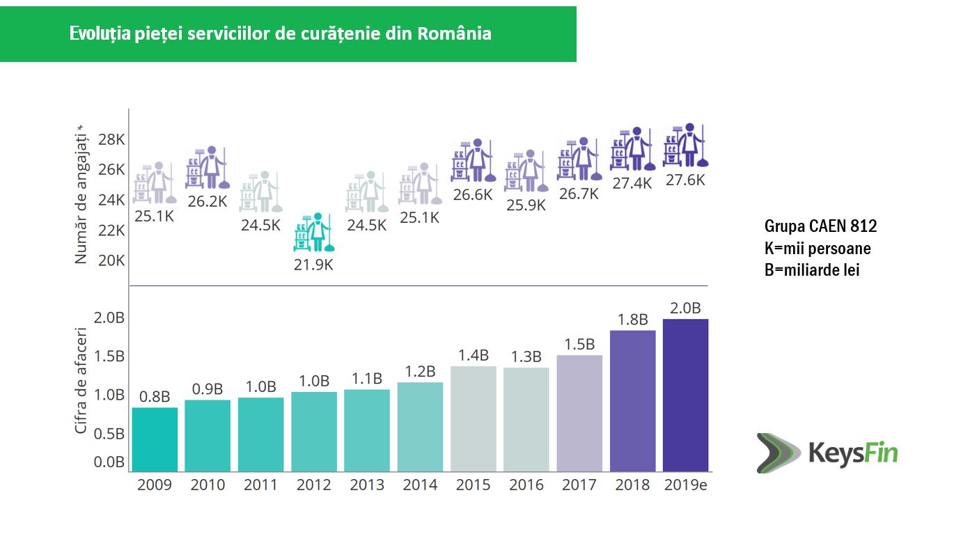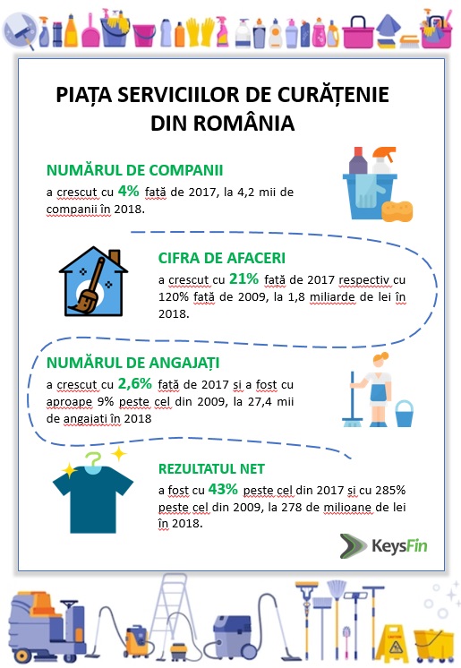 În ceea ce privește cifra de afaceri a pieței locale de servicii de curățenie (fie că este vorba despre întreținerea curățeniei, curățenia generală sau post-construcție), aceasta a crescut cu 21% față de 2017, respectiv cu 120% față de 2009, ajungând la 1,8 miliarde de lei în 2018.