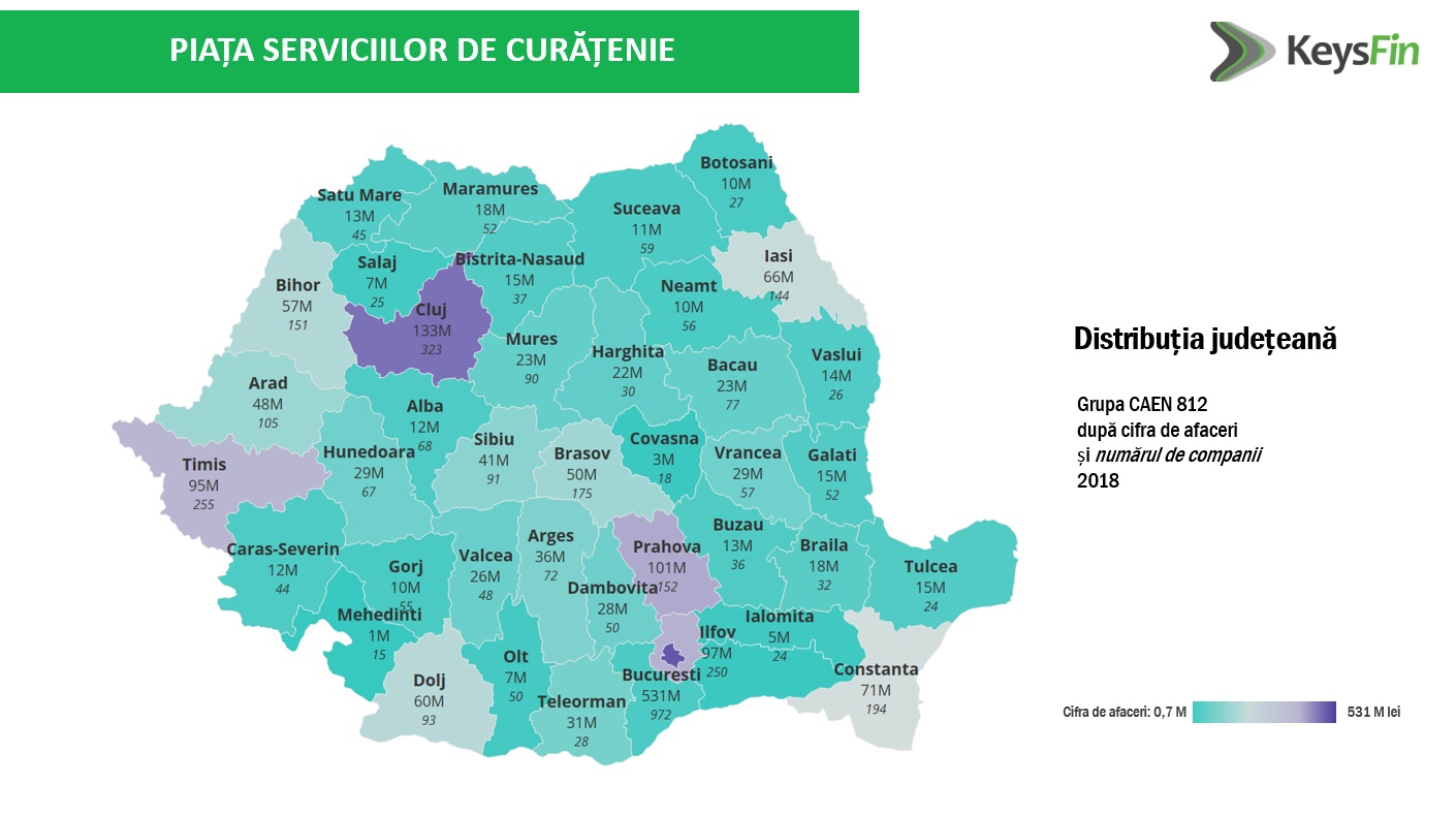 În ceea ce privește distribuția geografică a business-ului curățeniei, Bucureștiul se află pe primul loc, cu o cifră de afaceri de 531 milioane de lei, reprezentând 29% din total, județul Cluj pe locul secund, cu o cifră de afaceri de 133 de milioane lei și 7,3% din total, iar Prahova se clasează pe poziția a treia, cu o cifră de afaceri de 101 milioane de lei și 5,5% din total.