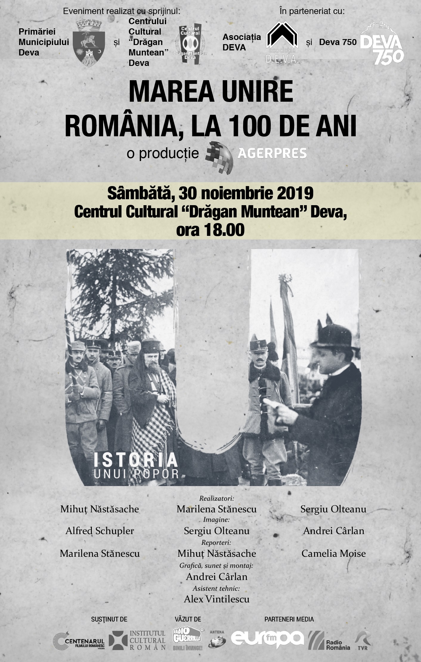 ”Ne face o plăcere deosebită să găzduim, la Deva, un eveniment cultural de amploare națională. Județul în care se află fosta capitală a dacilor nu putea lipsi de pe harta Centenarului Filmului Românesc. Localnicii și turiștii, deopotrivă, au ocazia să vizioneze două producții care aduc noul și vechiul istoric – atât prin film artistic, cât și prin peliculă de tip documentar. Vă invit să participați la acest eveniment de excepție!” – Nicolae-Florin Oancea, Primarul Municipiului Deva.