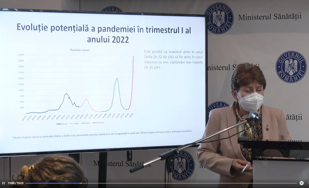 „Primul val, cu tulpina clasică, a intrat tulpina alfa, am avut o perioadă de linişte până când în vară a intrat tulpina Delta, cu severitate crescută. Previziunile noastre arată că este posibil ca maximul atins în valul anterior să fie atins mult mai repede în situaţia prezentă, în 31 zile faţă de 52 de zile cât a durat pentru valul anterior. Nu înseamnă că vom avea 25 de mii de cazuri, pot fi mai multe. Dorim să arătăm panta ascendentă cu creşterea numărului de cazuri având în vedere vulnerabilităţile de mai devreme”, a decarat Pistol.