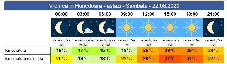 Sâmbătă, soarele va domina cerul și va răsari la ora 06:36. Aerul va fi greu respirabil din cauza indicelui ridicat de temperatură-umezeală. Spre seară, temperaturile se vor menține calde, iar soarele va apune la ora 20:24. Valorile maxime resimțite se vor situa între 29 și 32 de grade.