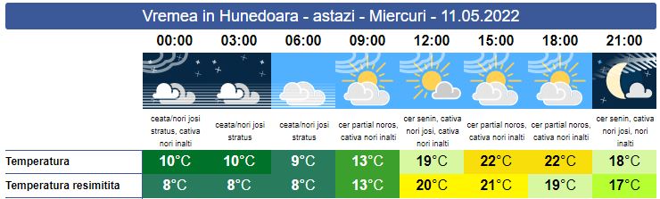Miercuri, vremea își va reveni la normalul perioadei. Soarele răsare la ora 06:00. Local, pe timpul nopții și în prima parte a zilei se va înregistra ceața. Cerul se va însenina, iar temperaturile vor crește gradual. Vântul va sufla slab și moderat cu ușoare intensificări în zonele de deal și munte. Soarele va apune la ora 20:48. Valorile termice minime se vor situa între 9 și 12 grade, iar cele maxime vor urca în jur de 22 de grade.