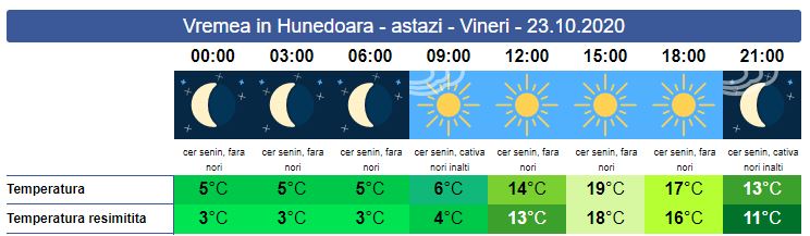 Vineri, soarele va răsari la ora 7:53 și va încălzi atmosfera pe toată perioada diurnă a zilei. Timp de câteva zile vom scăpa de diminețile foarte friguroase, termometrele înregistrând valori pozitive în creștere. Ziua va fi frumoasă, cerul senin și vremea plăcută ne îndeamnă să petrecem ziua cât mai mult în aer liber. Soarele apune la ora 18:30. Temperaturile minime se vor încadra între 6 și 7 grade, iar maxima zilei va urca spre 19 de grade, la umbră.