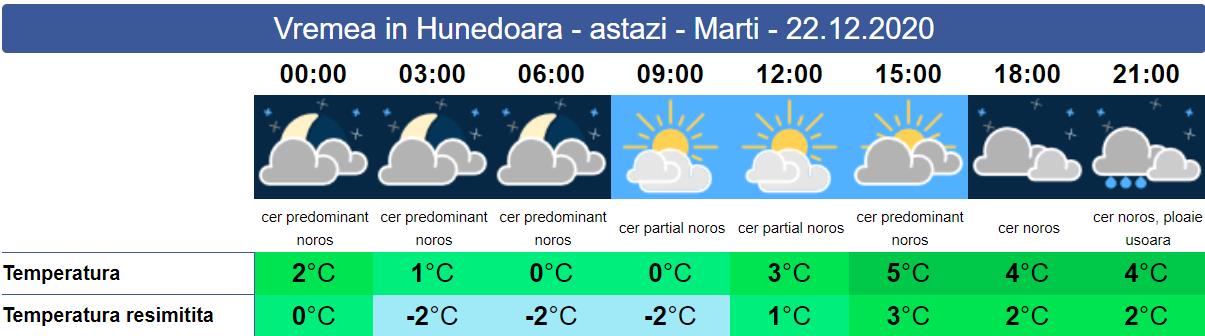 Marți, ziua debutează în ceață. Soarele răsare la ora 08:05. Până spre miezul zilei, e posibil să vedem și lumina soarele ce se revarsă peste nori, iar din a doua parte a zilei va continua să se înnoreze. Spre seară se așteaptă ploi și se va semnala polei. Vântul va sufla slab spre moderat cu unele intensificări la munte. Soarele apune la ora 16:49. Temperaturile minime se vor resimți între -2 și 0 grade, iar maximele în jurul valorii de 5 grade.