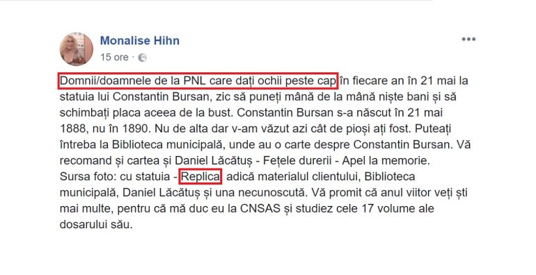 ‘’ Domnii/doamnele din PNL care dați ochii peste cap…’’ și continuă atacul împotriva liberalilor, care n-au fost destul de vigilenți să constate o eroare pe placa de pe statuia lui Constantin Bursan. Verbul este dur, gafa este considerată de neiertat, „inculții” sunt trimiși la bibliotecă, li se dau referințe bibliografice, dovezi, inclusiv ceea ce autoarea postării numește „materialul clientului”, o fotografie de pe Replica-INFO HD, site-ul nostru.