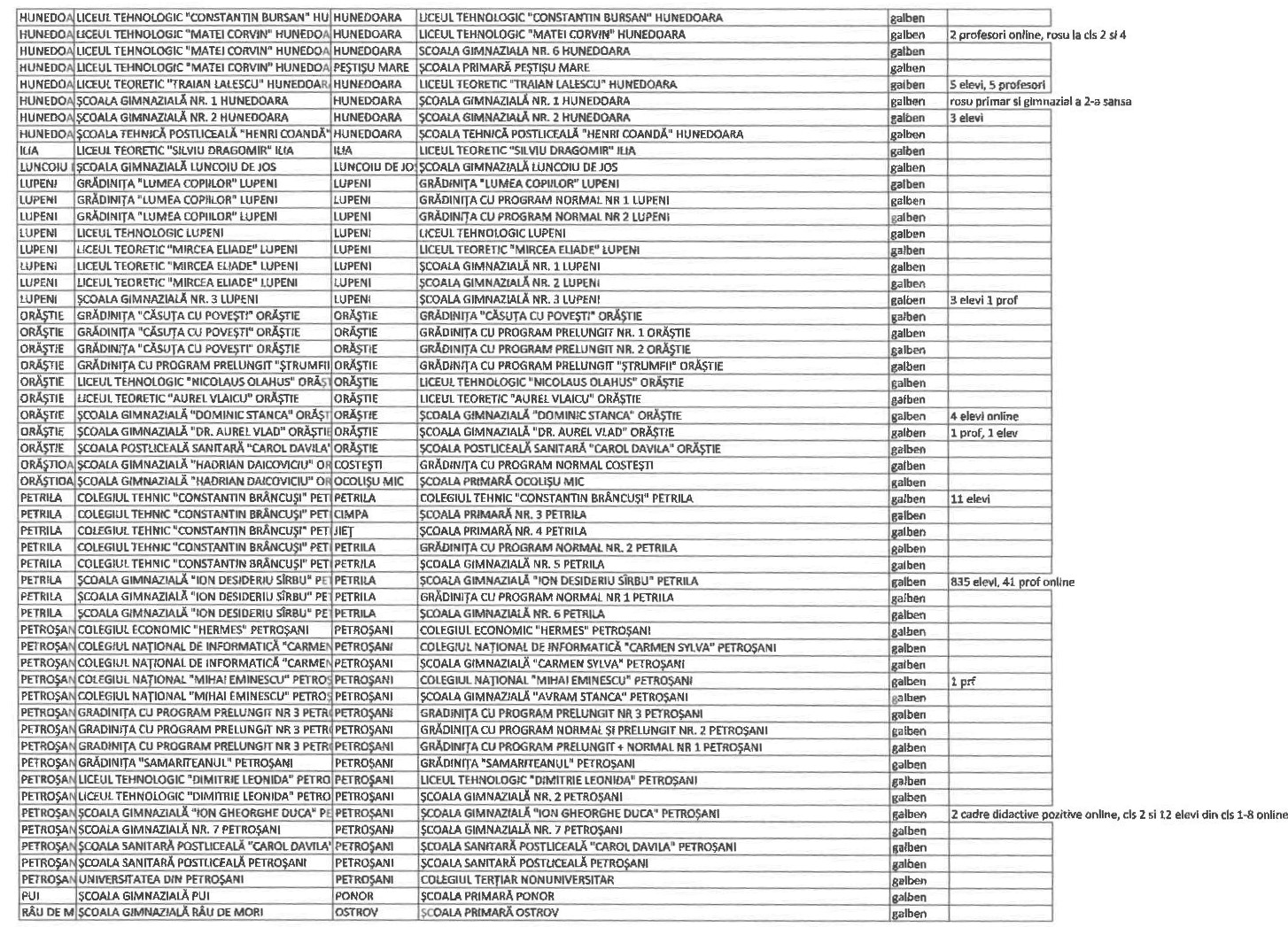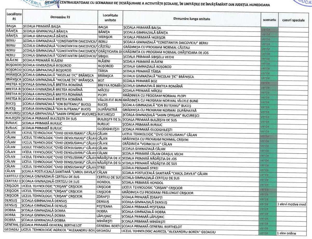 Prefectul județului Hunedoara, Călin Petru Marian, a convocat astăzi Comitetul Județean pentru Situații de Urgență, care a aprobat Hotărârea nr. 16, privind scenariile de funcționare pentru instituțiile de învățământ din județul Hunedoara.