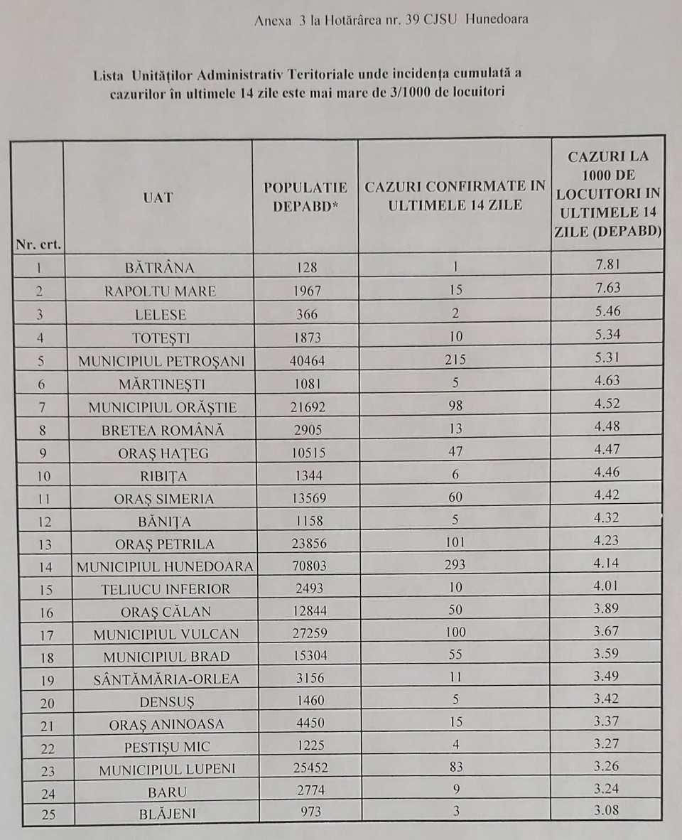 CJSU: Lista localităților în funcție de incidența cumulată a cazurilor în ultimele 14 zile