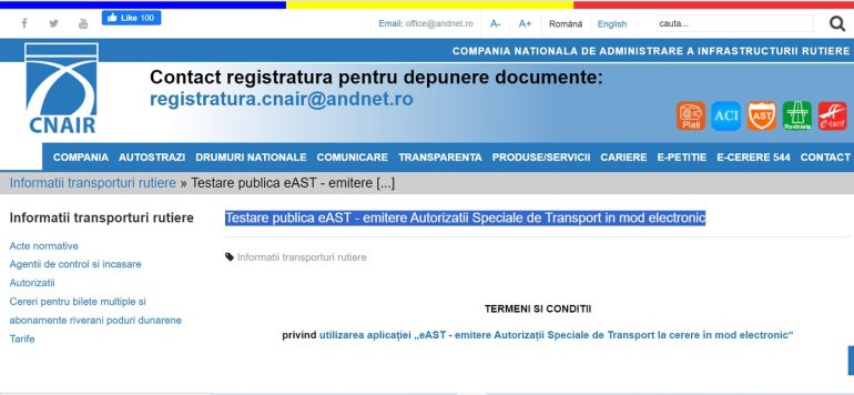 CNAIR lansează aplicația informatica “eAST – emitere Autorizații Speciale de Transport la cerere în mod electronic”, destinată obținerii Autorizațiilor Speciale de Transport (AST) de către operatorii de transport, cu plata tarifelor aferente, în mod automat, în baza datelor furnizate de solicitant, fără intervenția unui operator uman, ca parte a strategiei proprii privind procesul de digitalizare.