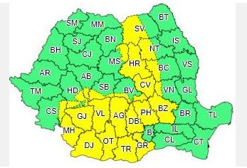 Sunt vizate de Codul galben judeţele Alba, Argeş, Bacău, Braşov, Buzău, Caraş-Severin, Covasna, Dâmboviţa, Dolj, Gorj, Giurgiu, Hunedoara, Harghita, Mehedinţi, Neamţ, Olt, Prahova, Sibiu, Suceava, Teleorman.