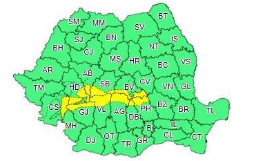 Codul galben vizează judeţele Alba, Argeş, Braşov, Caraş-Severin, Dâmboviţa, Gorj, Hunedoara, Prahova, Sibiu şi Vâlcea.