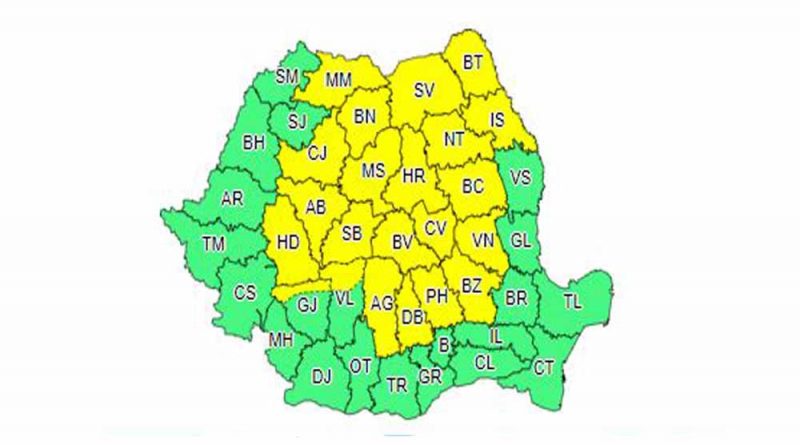 Cod Galben de precipitații și vânt în rafale în peste 20 de județe