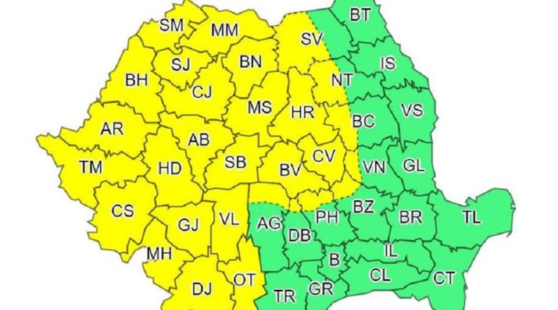 Meteorologii au emis o atenţionare cod galben de vânt puternic şi ploi abundente valabilă de sâmbătă dimineaţă până duminică noapte în jumătatea vestică a ţării şi în centru, în Banat, Crişana, Maramureş, Transilvania şi Oltenia, urmând ca în judeţele din aceste zone vântul să aibă intensificări de până la 75 de kilometri pe oră, mai puternic la munte, de peste 80-100 de kilometri pe oră. Vor fi averse însoţite de descărcări electrice şi se vor înregistra cantităţi de apă de 30-40 de litri/mp, în timp ce duminică, la munte, ploile se vor transforma în lapoviţă şi ninsoare, iar spre seară se va depune un strat nou de zăpadă.