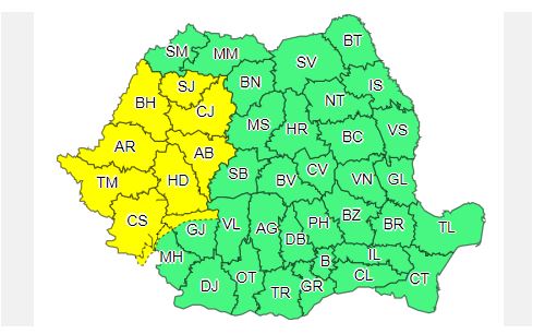 Administraţia Naţională de Meteorologie (ANM) a emis o atenţionare Cod galben de instabilitate atmosferică accentuată, valabilă de vineri, de la ora 18.00, până sâmbătă, la ora 10.00, în judeţele Bihor, Sălaj, Cluj, Alba, Hunedoara, Caraş-Severin, Timiş, Arad, precum şi în nordul judeţelor Gorj şi Mehedinţi.