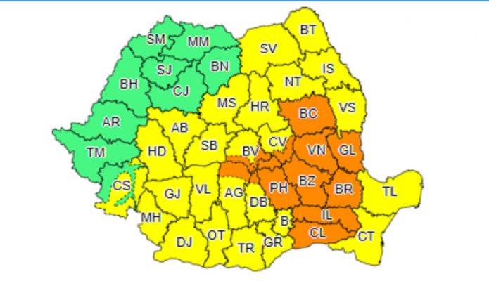 De asemenea, de la ora 12.00, până sâmbătă la ora 23.00, va fi cod portocaliu în judeţele Bacău, Galaţi, Vrancea, Brăila, Ialomiţa, Călăraşi, Buzău, Prahova şi în zona de munte a judeţelor Dâmboviţa, Argeş, Braşov şi Covasna.
